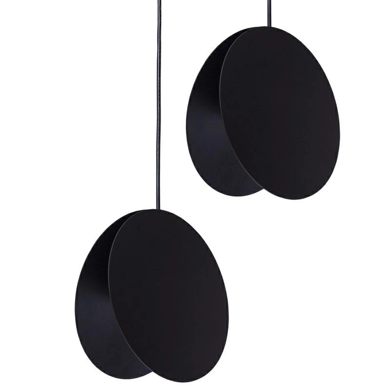 Minimalistyczna lampa złożona z dwóch metalowych kół. kolor: czarny, rozmiar: wysokość 23 cm, rozmiar: szerokość 23 cm, rozmiar: głębokość 10 cm, rozmiar: długość kabla 200 cm, waga: 2,3 kg, źródło światła: Gu10*1 / max. 50 W, materiał: aluminium + metal, produkt złożony: tak