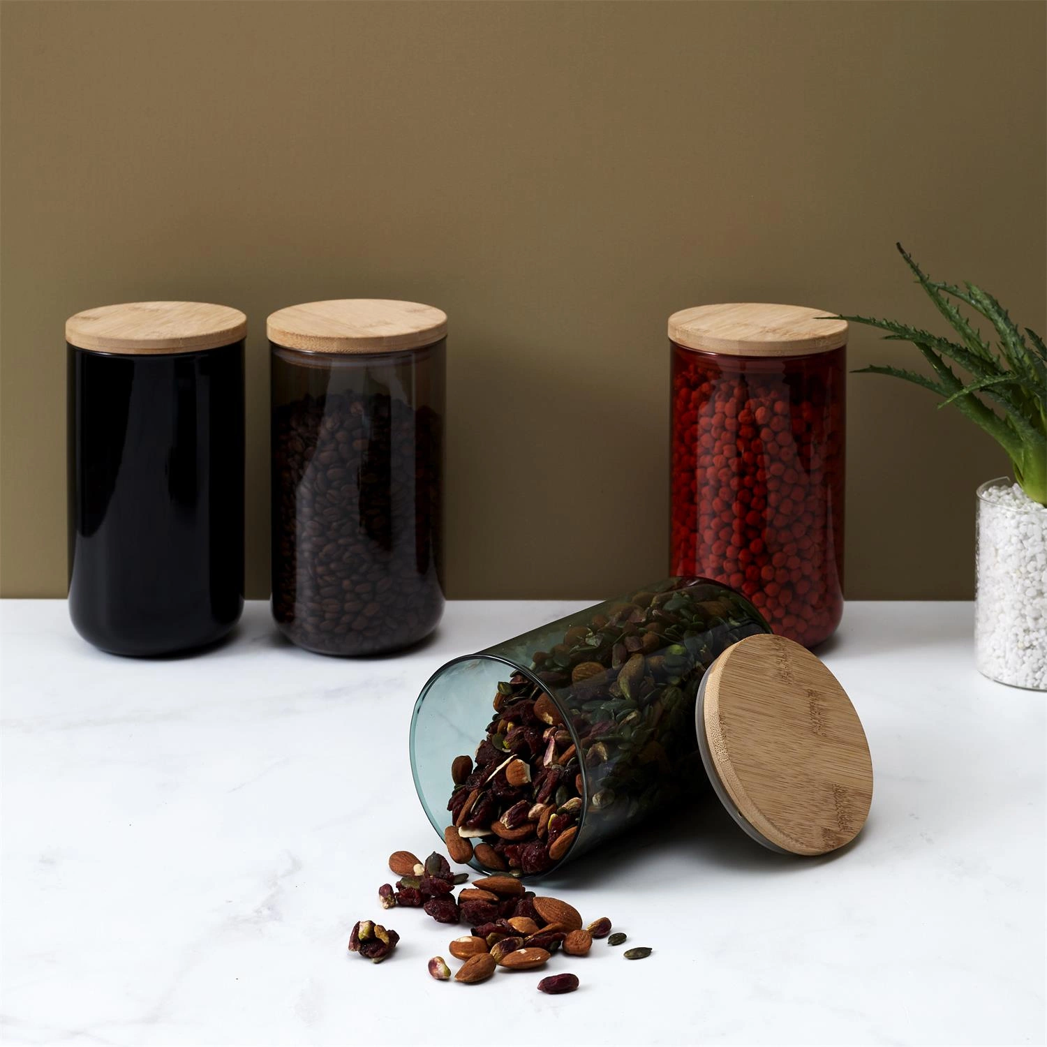 Estetyczny i praktyczny szklany pojemnik z pokrywką z bambusa to idealne rozwiązanie do przechowywania żywności w stylowy sposób. Dzięki cylindrycznemu kształtowi i eleganckiemu designowi, pojemnik nie tylko umożliwia organizowanie produktów spożywczych, ale także stanowi ozdobę każdej kuchni. Dostępny w czterech modnych kolorach: czarnym, szarym, terrakota i niebieskim, pozwala dopasować się do różnych aranżacji wnętrz.
