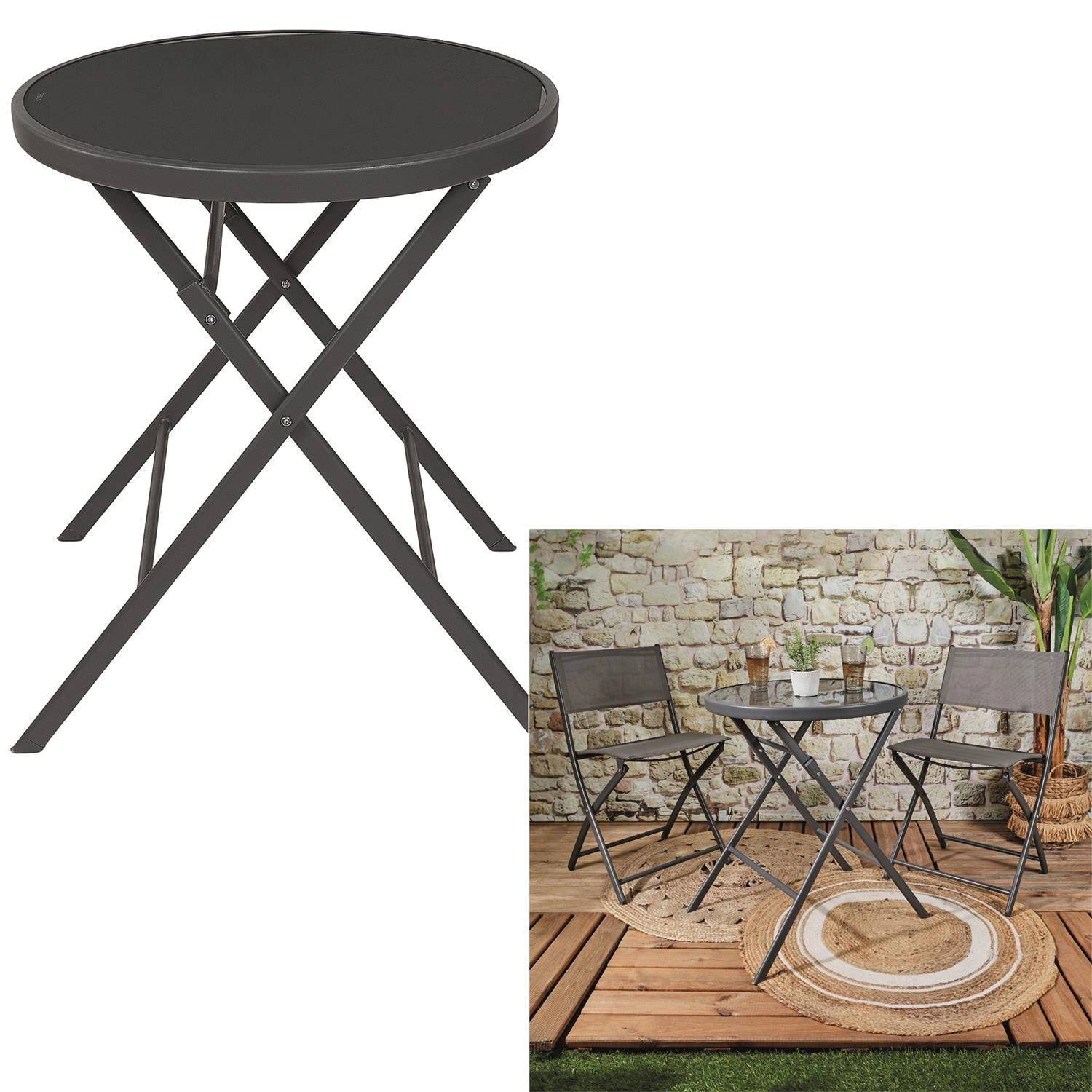 • Okrągły, składany stół o średnicy 60 cm, idealny na balkon, patio czy taras.