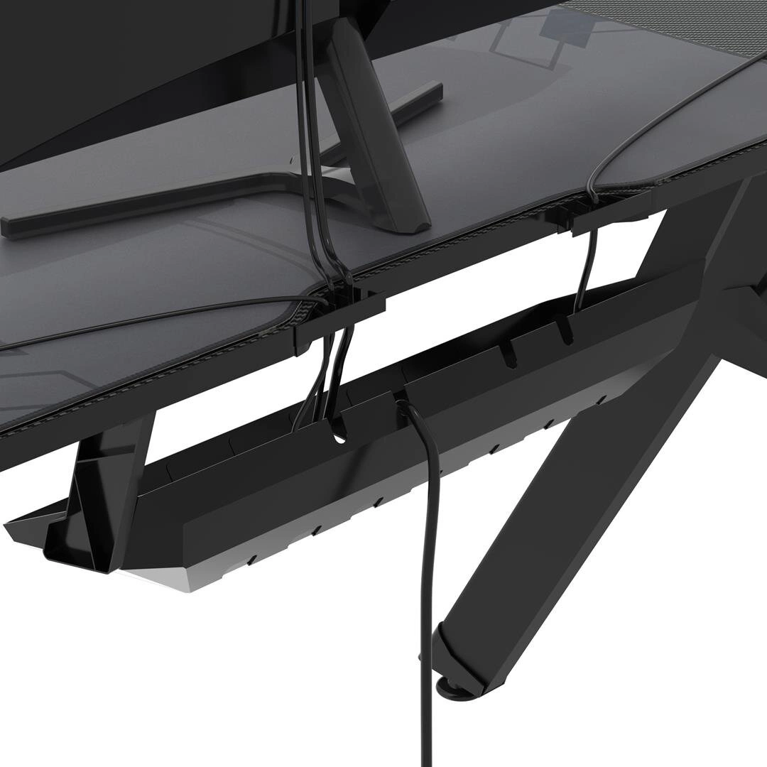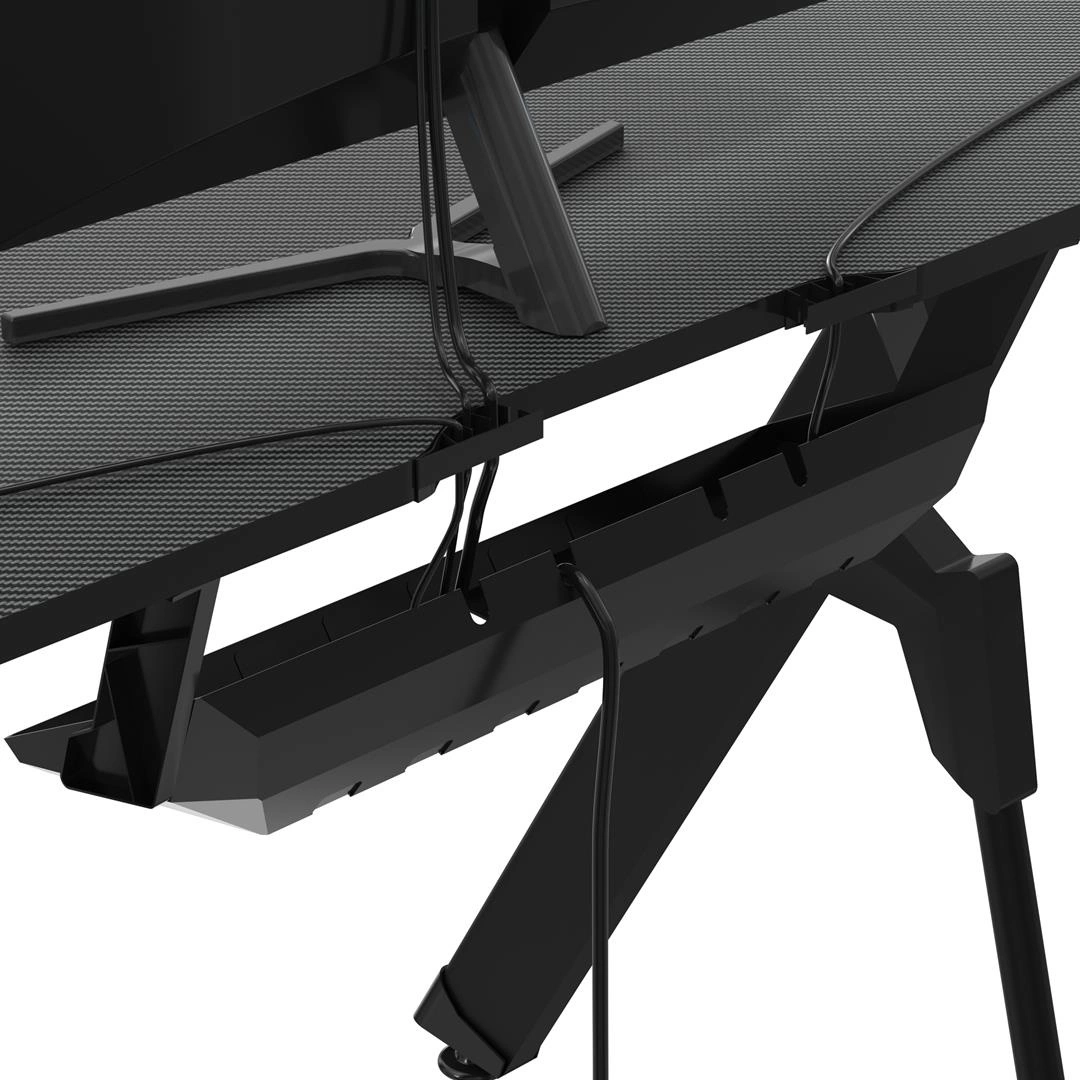 Jedną z największych zalet tego biurka jest obecność specjalnej półki na listwy zasilające oraz systemu porządkowania kabli, dzięki czemu unikniesz plątaniny kabli i utrzymasz porządek wokół swojego stanowiska. Nie zapomniano o uchwycie na słuchawki i kubek, co pozwoli Ci mieć wszystko pod ręką. W zestawie znajdziesz także stojak na pady z portami USB do ładowania, dzięki czemu będziesz mógł cieszyć się nieprzerwaną rozgrywką. Jego blat o grubości 15mm wykonany z płyty wiórowej i pokryty karbonową powłoką nie tylko prezentuje się niesamowicie, ale także zapewnia trwałość i wytrzymałość na długie godziny intensywnej rozgrywki.