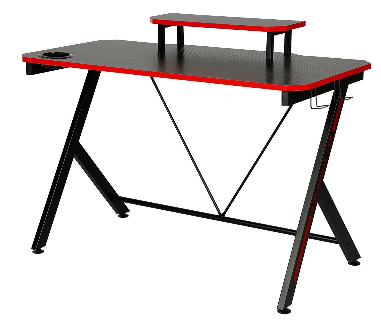 Wykonany z płyty laminowanej oraz metalowy stelaż malowany proszkowo, biurko Viktor zapewnia stabilność i trwałość przez długi czas użytkowania. Jego wymiary - 60 cm głębokości, 120 cm szerokości i 76 cm wysokości (88 cm z nadstawką) - zapewniają wystarczającą przestrzeń na monitor, klawiaturę, mysz oraz inne akcesoria gamingowe. Dodatkowe funkcje, takie jak plastikowy uchwyt na kubek i metalowe haczyki na np. słuchawki, sprawiają, że biurko jest nie tylko wygodne w użytkowaniu, ale także organizuje przestrzeń gracza. Kolorystyka w czerni z czerwonymi wstawkami nadaje mu dynamicznego wyglądu, który doskonale wpisuje się w estetykę świata gamingu.