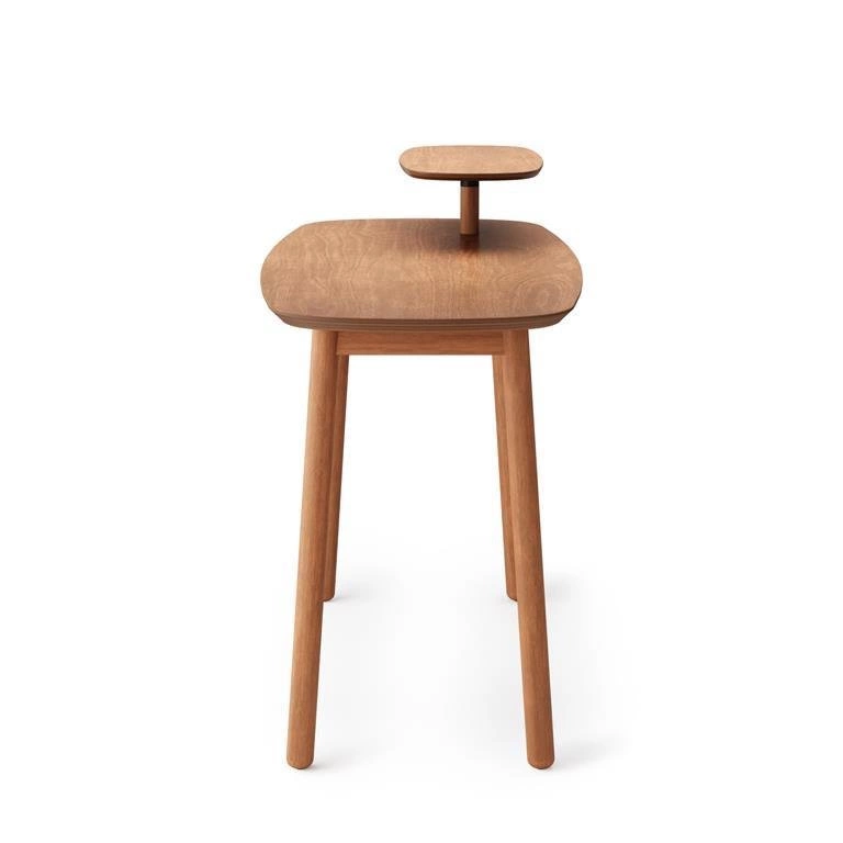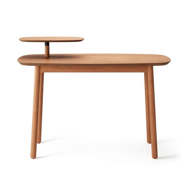 Biurko Swivo oprócz blatu o szerokości 127 cm posiada także podwyższoną półkę, zapewniającą dodatkowe miejsce do przechowywania. Jest ona obrotowa, co ułatwia dostęp do znajdujących się na niej przedmiotów. Jak wszystkie meble z tej kolekcji, także i biurko posiada delikatnie zaokrąglone brzegi. Taki efekt dodaje całej konstrukcji subtelnego, nowoczesnego akcentu. Biurko zostało wykonane z naturalnego drewna z użyciem metalu. Podstawę Swivo stanowią cztery stabilne nogi, wykonane z tego samego materiału. Mebel dostępny w dwóch kolorach: naturalnym i orzechowym.