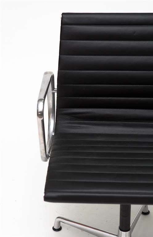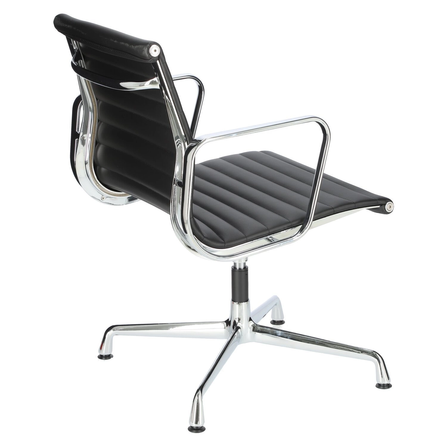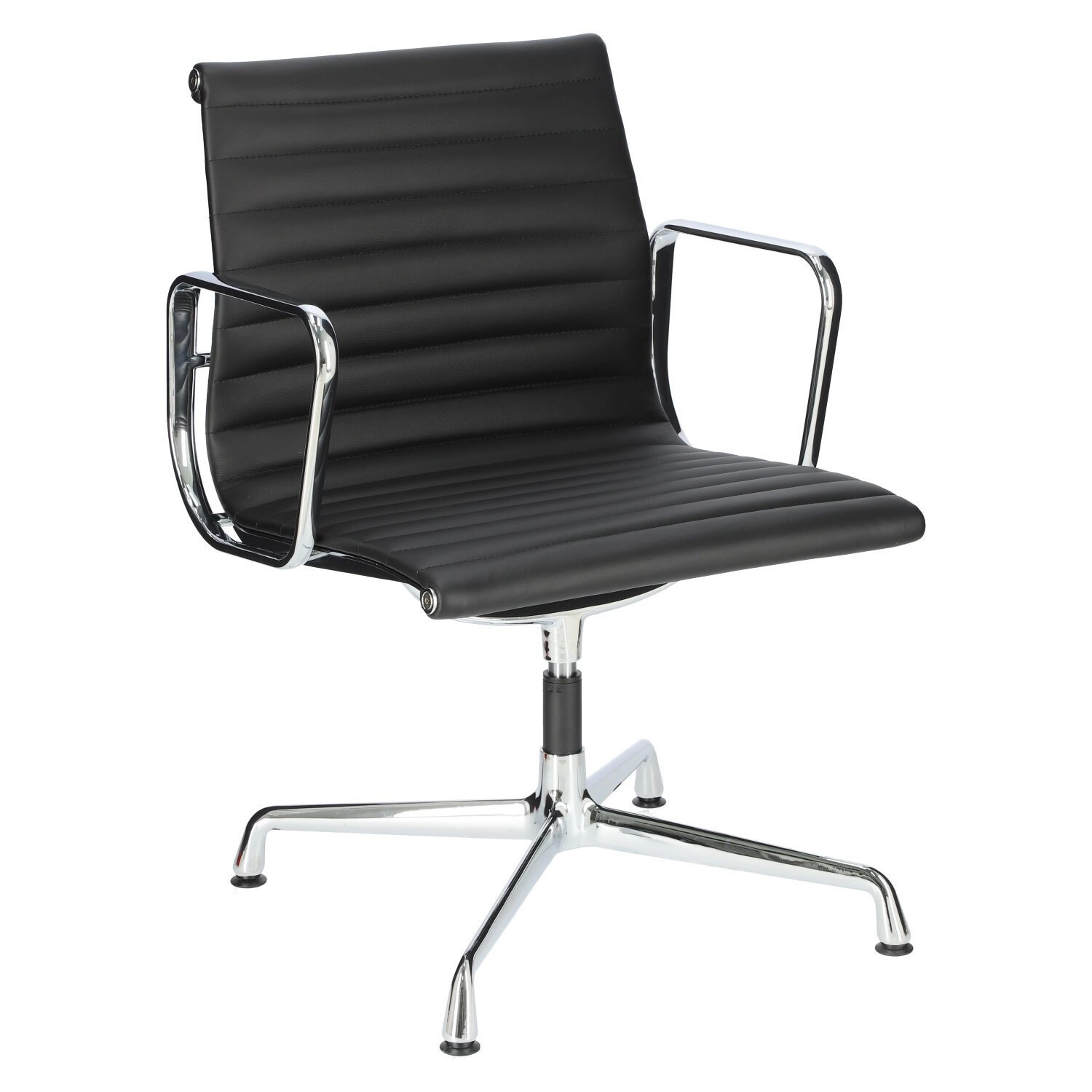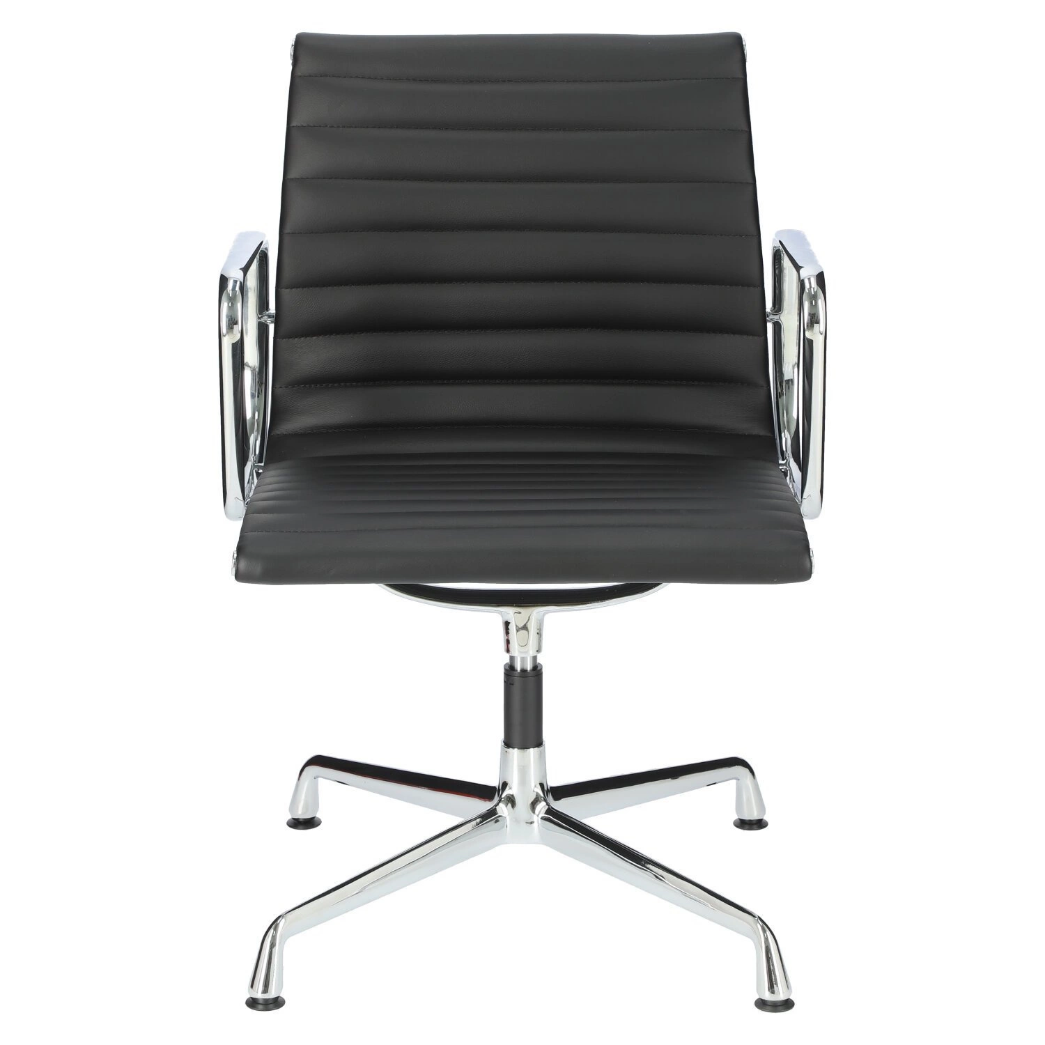 Fotel konferencyjny CH1081 to perfekcyjne połączenie ergonomicznego obrotowego siedziska tapicerowanego czarną skórzaną tapicerką, wygodnych metalowych podłokietników i podstawy z chromowanej stali. Jego ponadczasowy design nawiązuje do jednego ze słynnych projektów Ray i Charlesa Eamesów i uosabia to, co najważniejsze w przypadku fotela konferencyjnego, czyli nienaganną prezencję i wygodę. Tym, co wyróżnia fotel biurowy CH1081 jest jego nietypowa budowa. Skórzany materiał siedziska jest przymocowany do boków chromowanej ramy, dzięki czemu idealnie dopasowuje się do krzywizny kręgosłupa i pozwala na komfortowe użytkowanie nawet przez kilka godzin. Niezwykła elegancja tego fotela biurowego to zasługa doskonałego połączenia materiałów. Błyszcząca faktura metalowej ramy i delikatne matowe wykończenie skórzanej tapicerki pokrytej poziomymi przeszyciami, pozwoliło na stworzenie wyrafinowanego projektu, który doskonale sprawdzi się jako element wystroju nowoczesnego gabinetu czy sali konferencyjnej. Siedzisko posiada stałą wysokość (75 cm).