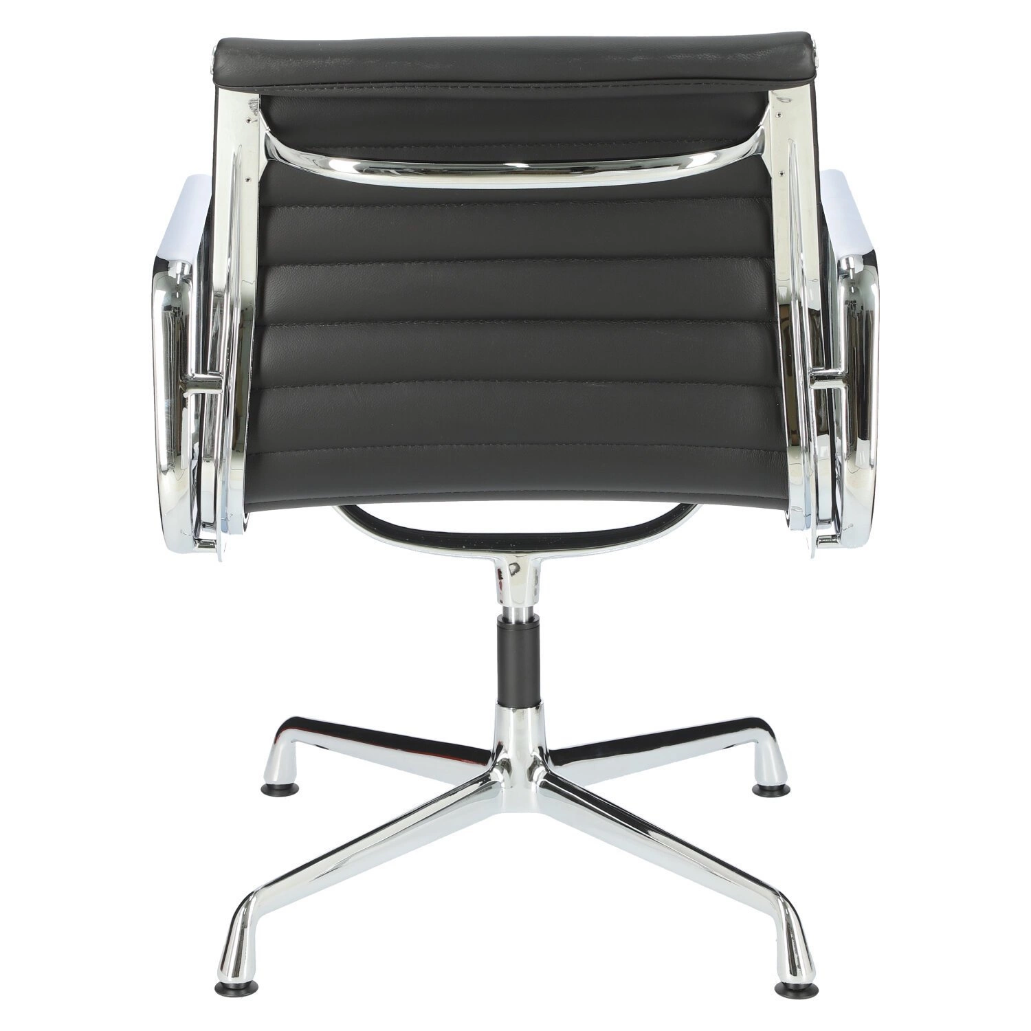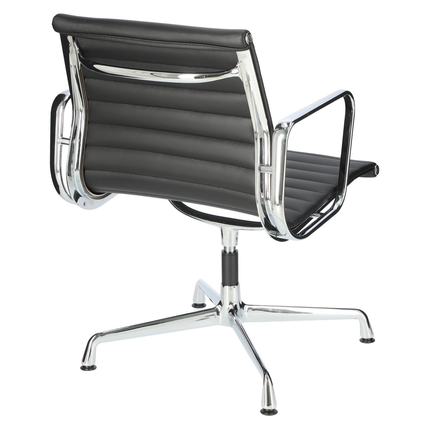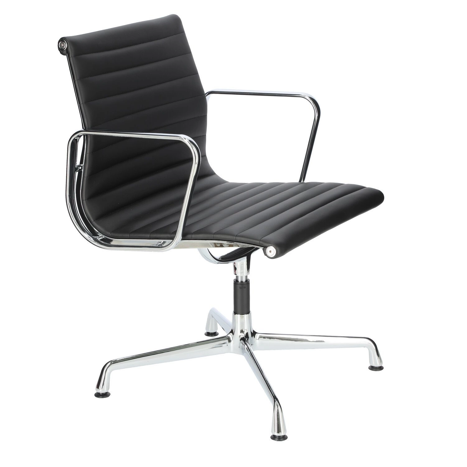 Fotel biurowy CH1081 marki D2.DESIGN to nowoczesny fotel obrotowy z podłokietnikami, tapicerowany naturalną czarną skórą i oparty na solidnej metalowej ramie. Przeznaczony do biura lub gabinetu, łączy wyrafinowany design inspirowany ikoną EA108 z wygodą codziennego użytkowania. Niewielkie wymiary – szerokość 58 cm, głębokość 57 cm i wysokość 75 cm – czynią z niego idealne krzesło biurowe do nowoczesnych przestrzeni, gdzie liczy się styl i ergonomia.