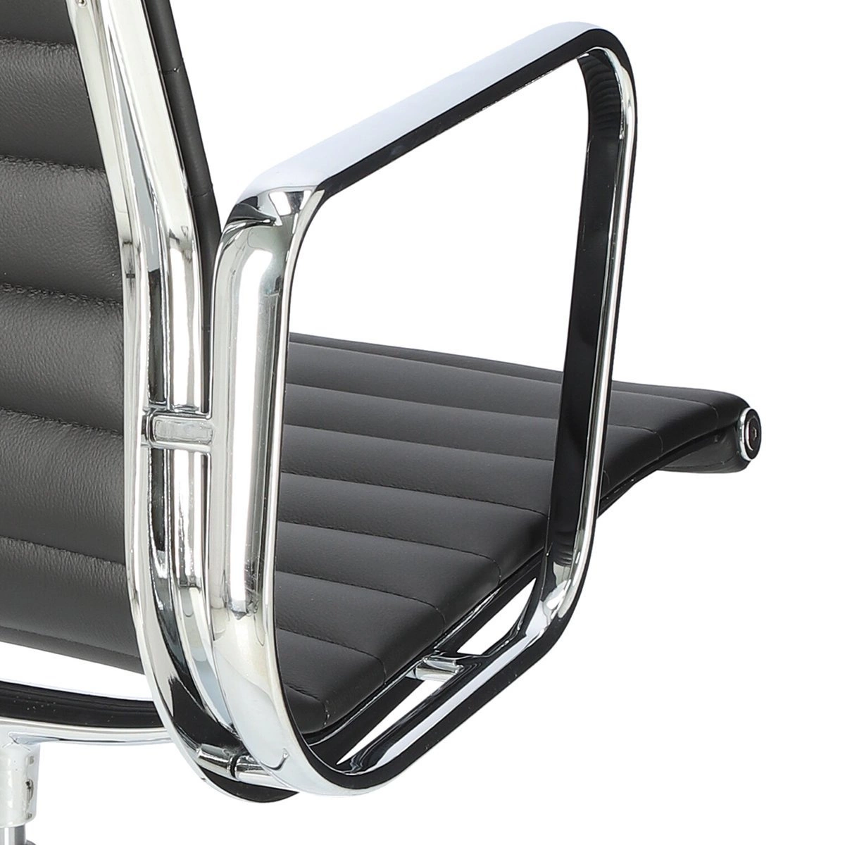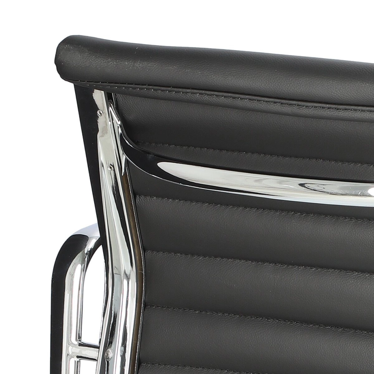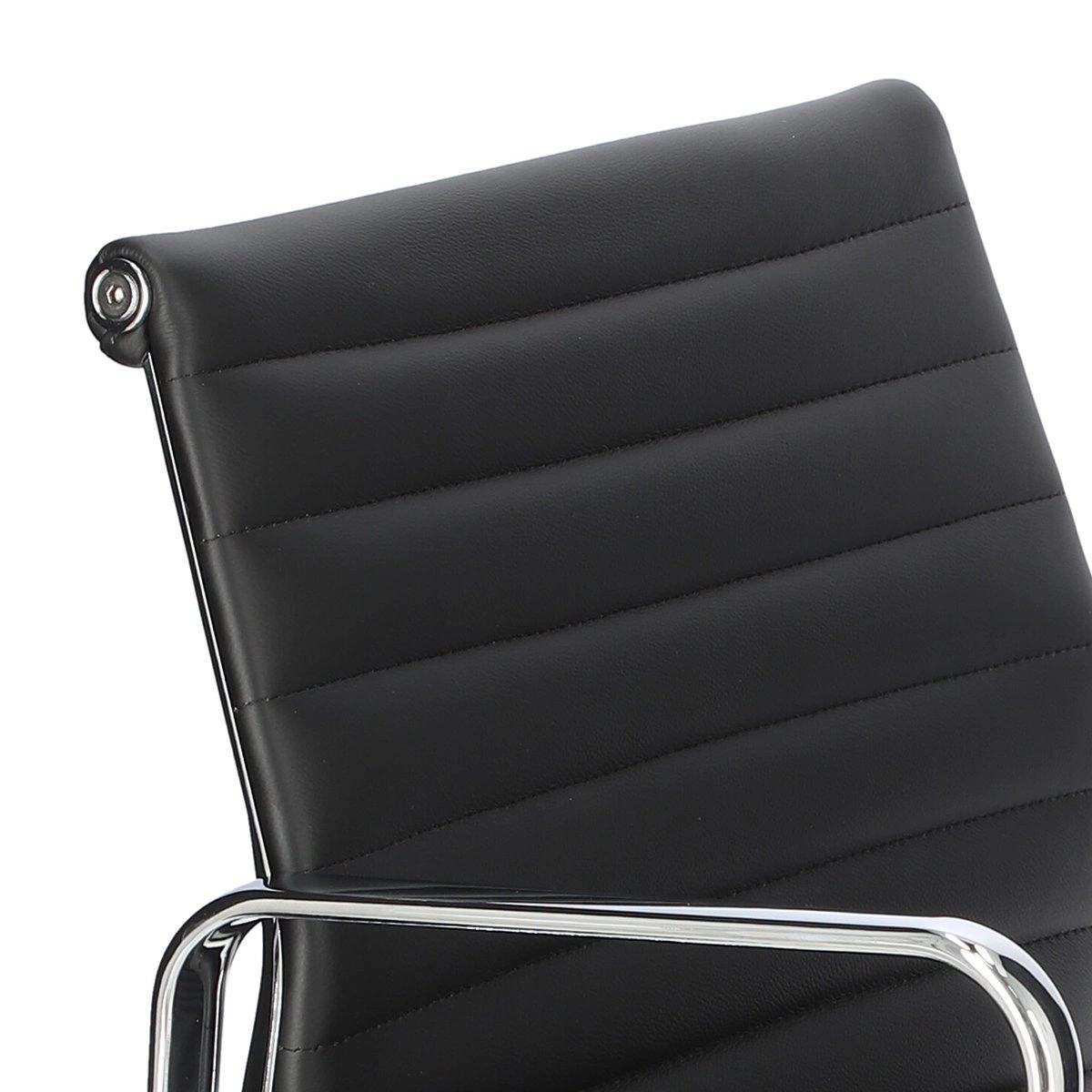 CH1081 to fotel biurowy skórzany, który od pierwszego spojrzenia przyciąga uwagę minimalistyczną formą i elegancją. Czarna, lekko matowa skóra naturalna z poziomymi przeszyciami doskonale współgra z lśniącą, metalową ramą. Taki wybór materiałów nadaje wnętrzu ponadczasowej klasy i tworzy idealne tło dla spotkań biznesowych czy codziennej pracy przy biurku. Bez trudu wkomponuje się zarówno w przestrzenie nowoczesne, jak i te w stylu glamour.