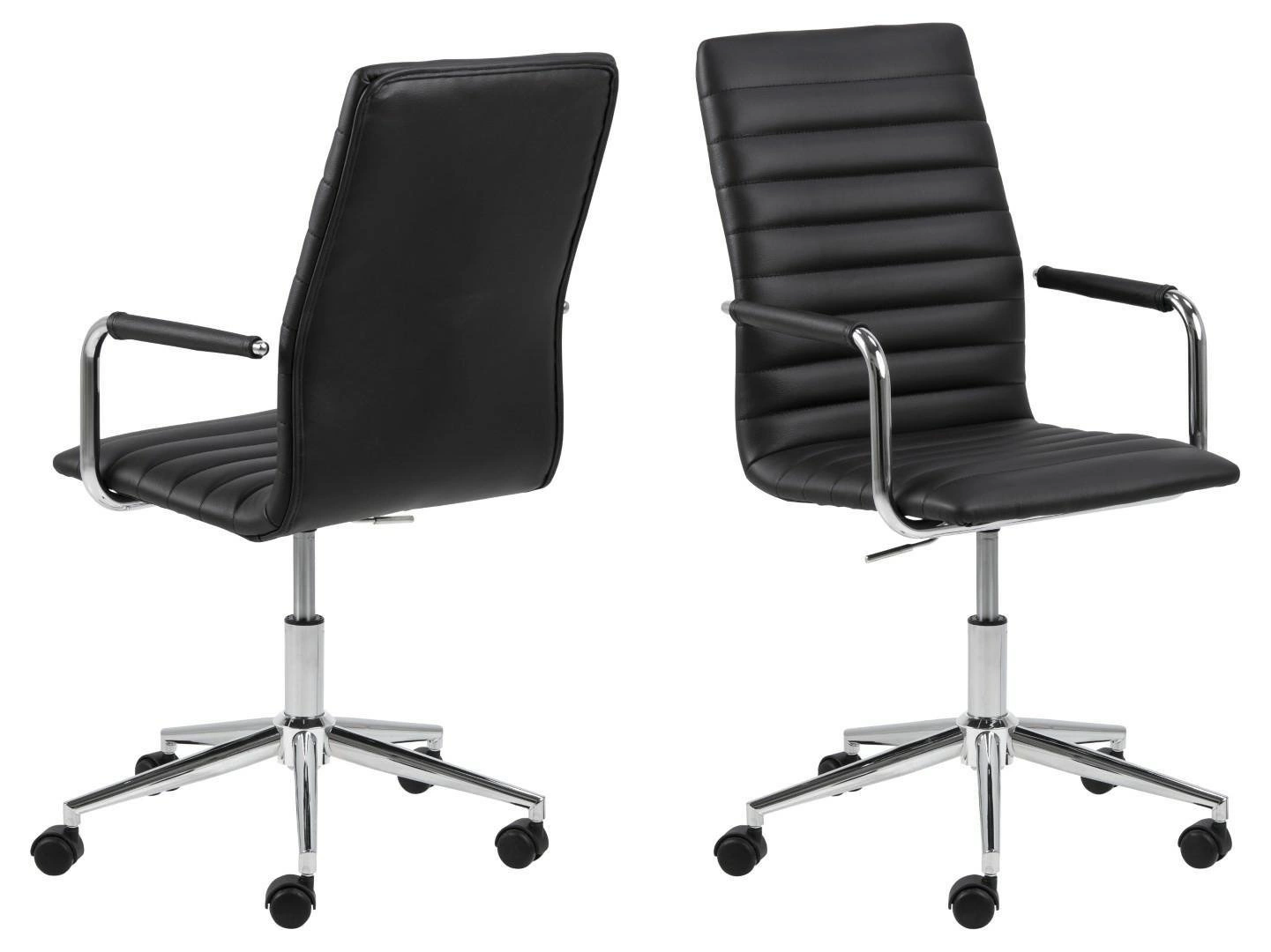 Siedzisko oraz oparcie krzesła zostały obite miękką, czarną ekoskórą. Poziome, regularne przeszycia na fotelu dodają mu nowoczesnego wyglądu.