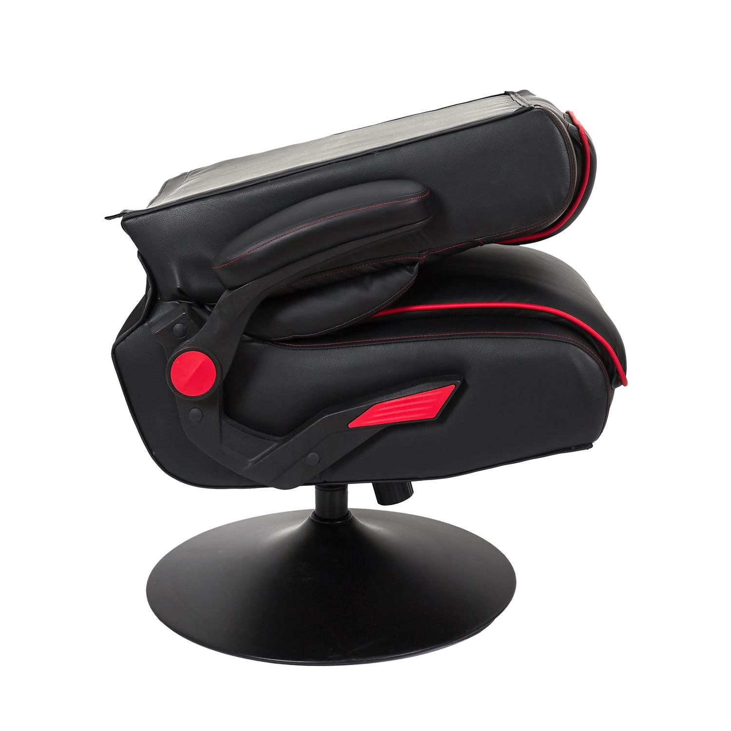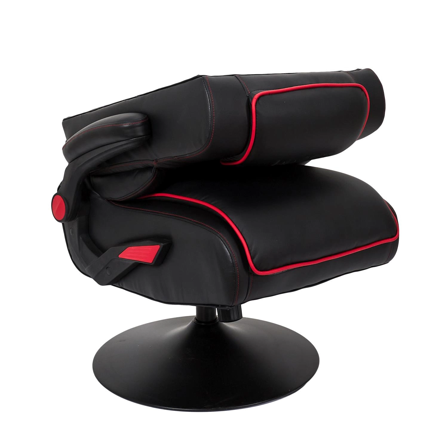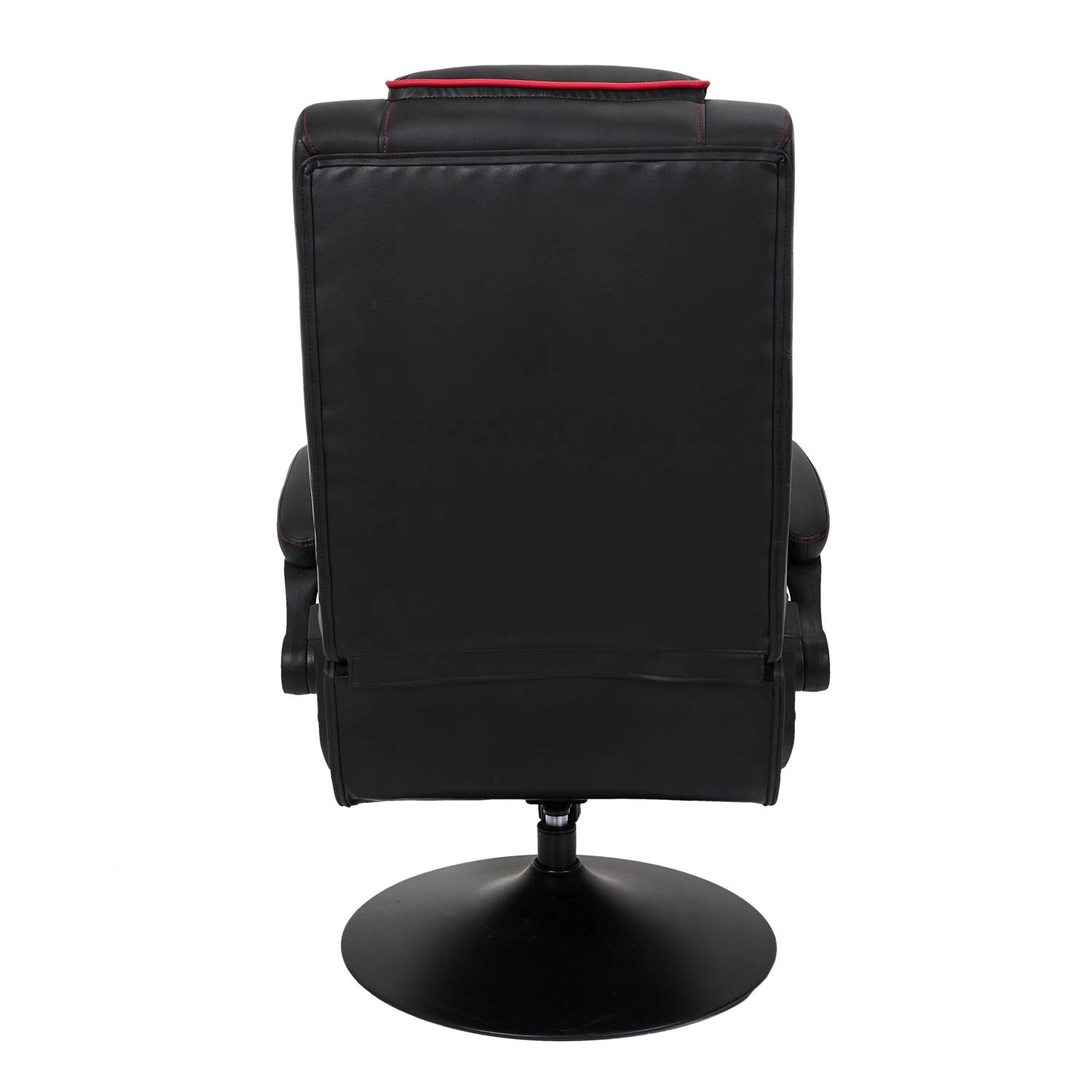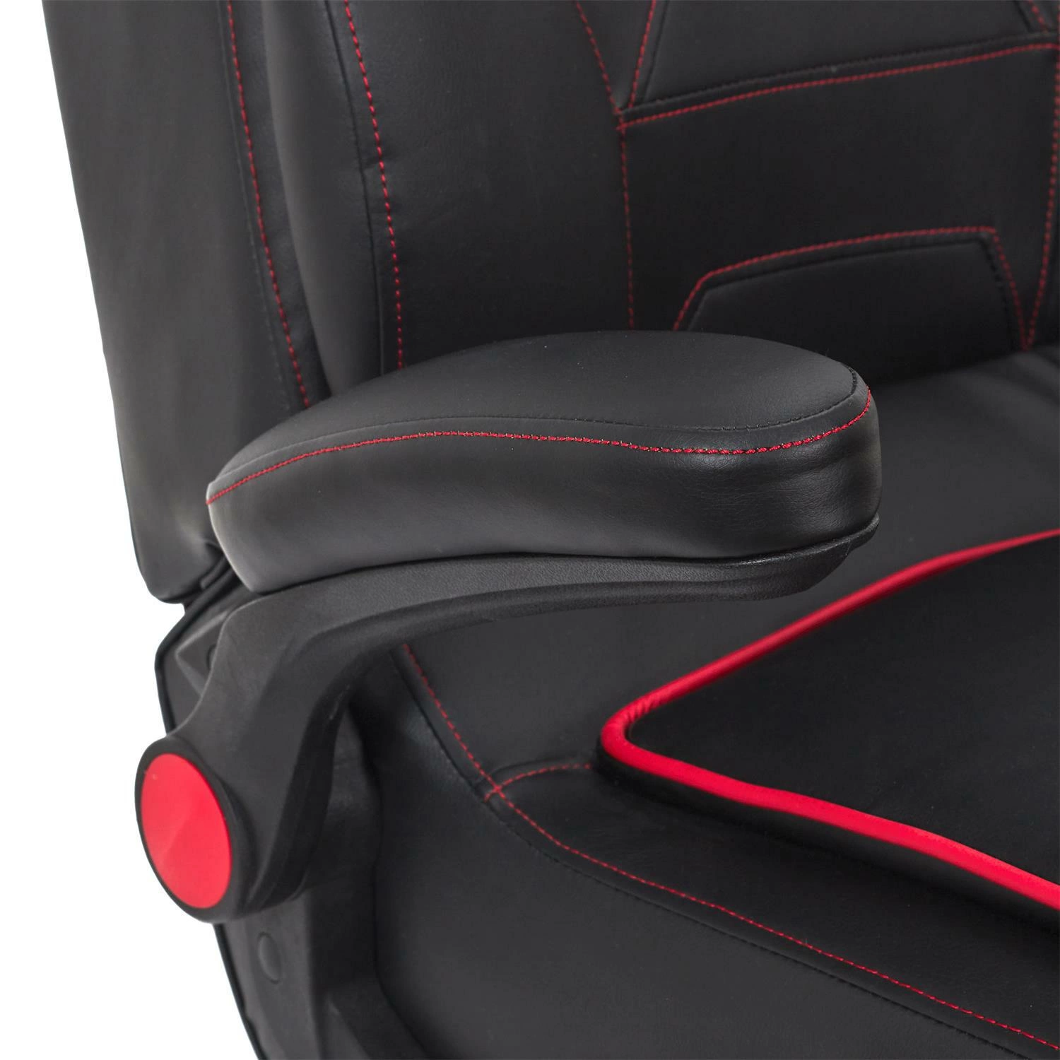 - Siedzisko oraz oparcie wykonane są z eko-skóry w kolorze czarnym, z czerwonymi wstawkami, które dodają fotelowi wyjątkowego charakteru.