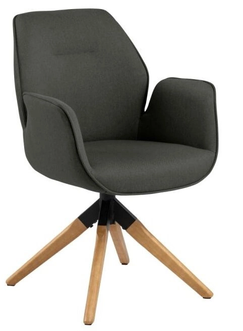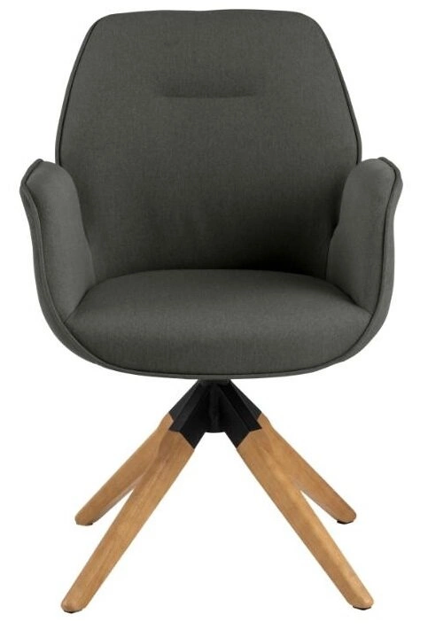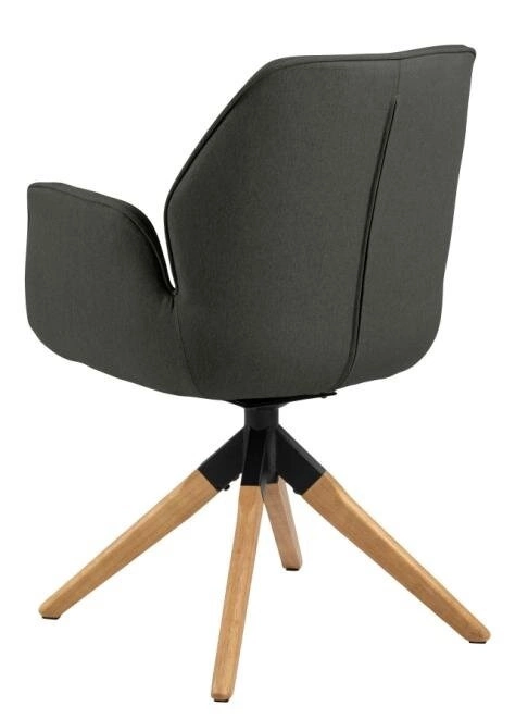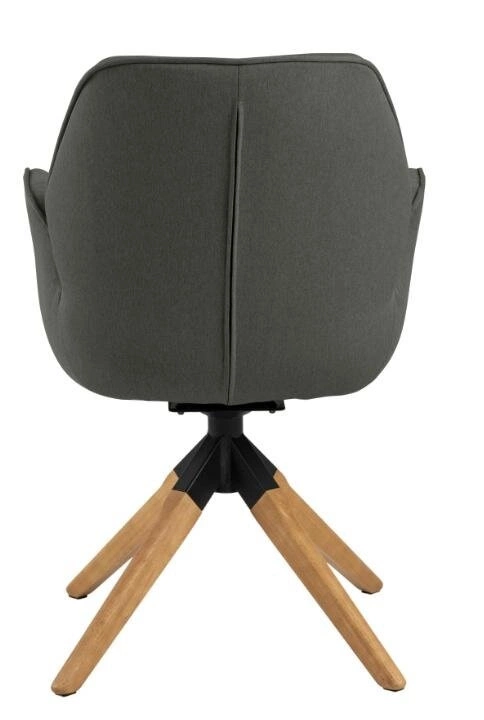 Krzesło obrotowe Aura to kwintesencja stylu skandynawskiego. Sprawdzi się w salonie, gabinecie czy sypialni. Obite przyjemną w dotyku i łatwą do utrzymania w czystości tkaniną Town w kolorze ciemnej szarości pomoże Ci stworzyć elegancką i jednocześnie przytulną aranżację. Krzesło jest wyjątkowo szerokie, rozłożysty kształt zapewnia pełen komfort użytkowania. Oparcie oraz podłokietniki są specjalnie wyprofilowane, by korzystanie z nich było jak najwygodniejsze. Pod spodem siedziska znajduje się metalowy mechanizm, dzięki któremu krzesło może się obracać. Cztery nogi z drewna kauczukowego w kolorze naturalnym wychodzą z jednego punktu. Rozchodzą się na boki pod lekkim kątem, dzięki czemu krzesło jest w pełni stabilne. Aura jest wygodna, praktyczna i stylowa. Będzie wyglądać doskonale w prostych, minimalistycznych wnętrzach.