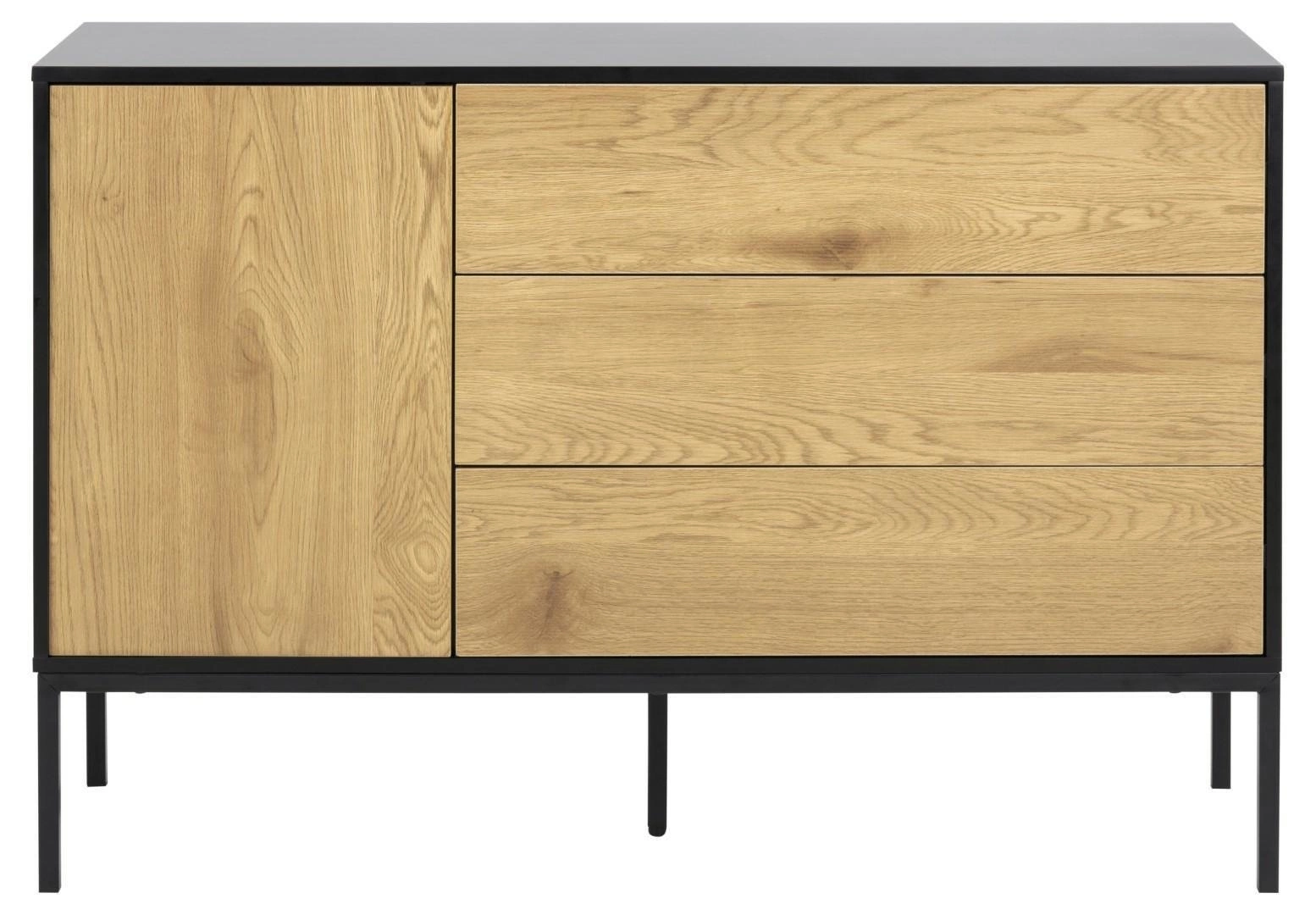 Komoda Seaford 120 cm czarna dąb naturalny z szufladami marki Actona to esencja nowoczesnego stylu z industrialnym akcentem. Praktyczny mebel o szerokości 120 cm i wysokości 82 cm został wyposażony w trzy pojemne szuflady oraz solidną podstawę na pięciu nogach. Połączenie czarnego drewna z naturalnym wykończeniem dębu sprawia, że komoda przyciąga wzrok i doskonale odnajduje się w roli komody do salonu lub sypialni.