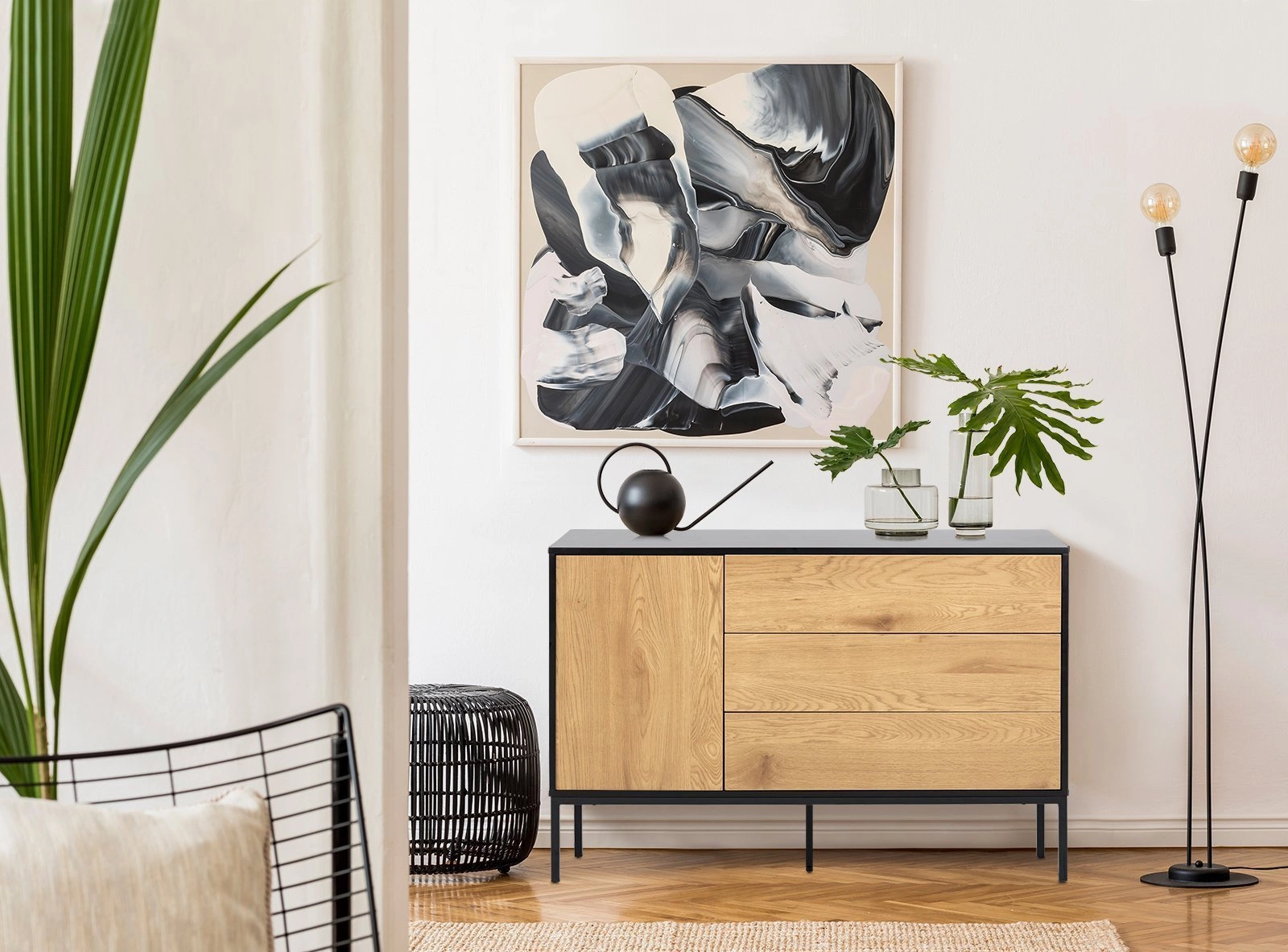 - Połączenie czerni i naturalnego dębu – łatwo dopasujesz komodę do różnych stylów wnętrzarskich