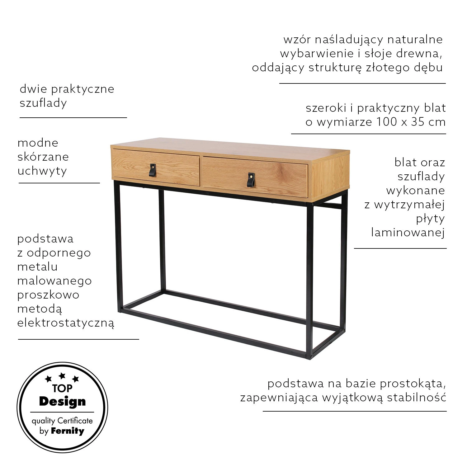 Abbott wyróżnia przede wszystkim subtelna w swej prostocie forma. Mimo prostej konstrukcji dobrane materiały sprawiają, że konsola charakteryzuje się swoistą lekkością. Blat wykonany został z trwałej i solidnej płyty laminowanej w kolorze złotego dębu. Nogi natomiast stanowi rama z bardzo wytrzymałego metalu, pomalowanego proszkowo na czarny mat. Blat oraz szuflady dają mnóstwo przestrzeni, którą można dowolnie zagospodarować. Ciekawe ułożenie nóg daje nie tylko stabilną podporę mebla, ale i sprawia, że konsola wygląda niebanalnie.