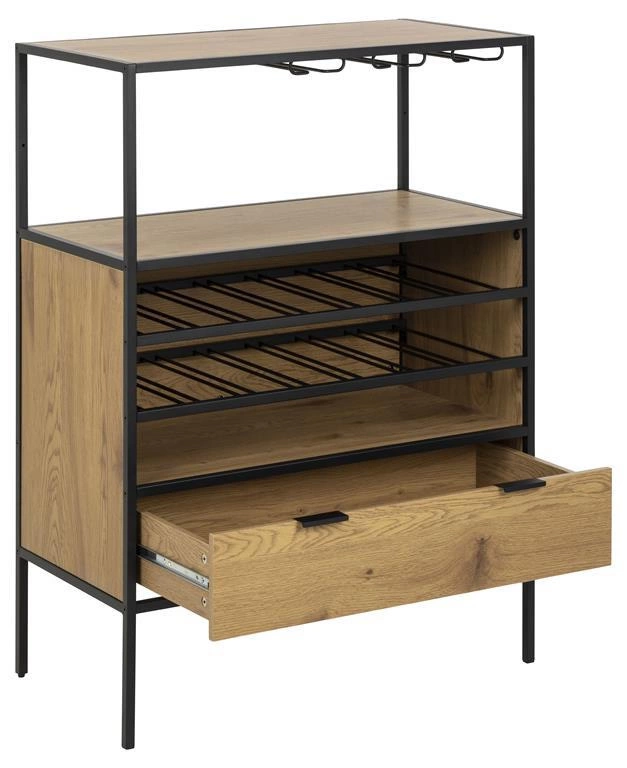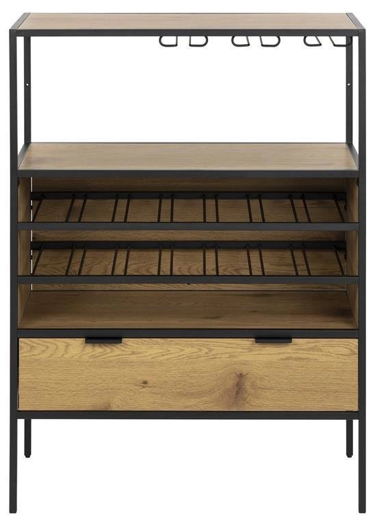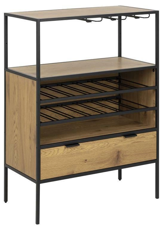 Szafka na wino Seaford od Actona to nowoczesny mebel w industrialnym stylu. Wyposażona w wykończenie z dębowego forniru, malowaną proszkowo na czarno metalową ramę, stojak na butelki i uchwyt na kieliszki oraz półki i szufladę do przechowywania - ta szafka na wino wniesie niesamowity charakter do każdego wystroju domu!