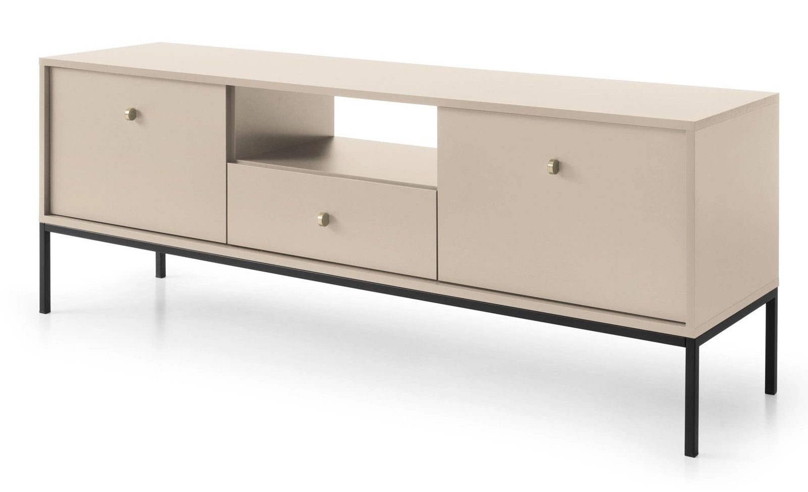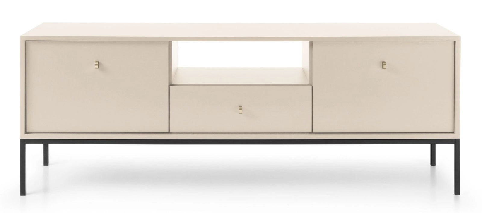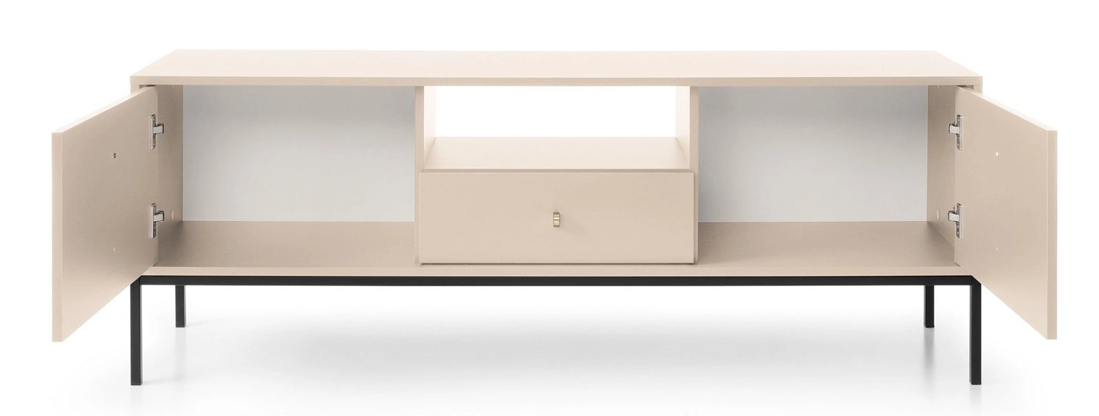 Minimalistyczna szafka RTV na wysokich nogach to mebel dla bardzo wymagających użytkowników. Szafka o gładkich frontach i klasycznym kształcie pozwoli na aranżacje nawet najbardziej wymagającego wnętrza. Uchwyty komody w kształcie pastylki, zrobione zostały z aluminium. Podstawą komody są wysokie nóżki, które ułatwiają wjechanie pod komodę robotom sprzątającym. Pakowna oraz elegancka szafka to rozwiązanie nie tylko do wnętrz nowoczesnych. Komoda pięknie prezentować się będzie również we wnętrzu boho lub nawet eklektycznym. Wymiary opakowania: 150x28x6cm i 160x43x9cm, Waga: 4 i 28kg