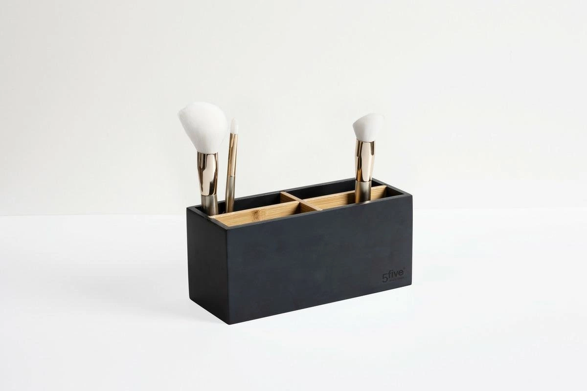 Organizer na kosmetyki do łazienki Natureo marki 5five simply smart to stylowy i praktyczny pojemnik wykonany z naturalnego drewna bambusowego w eleganckim, czarnym wykończeniu matowym. Cztery przegródki pozwalają zorganizować ulubione kosmetyki lub akcesoria do makijażu, dzięki czemu utrzymanie porządku na toaletce, w łazience czy na biurku staje się wyjątkowo łatwe. Kompaktowa szerokość 20 cm sprawia, że organizer bez problemu zmieści się nawet na niewielkiej półce lub blacie, zapewniając wygodny dostęp do najpotrzebniejszych drobiazgów.