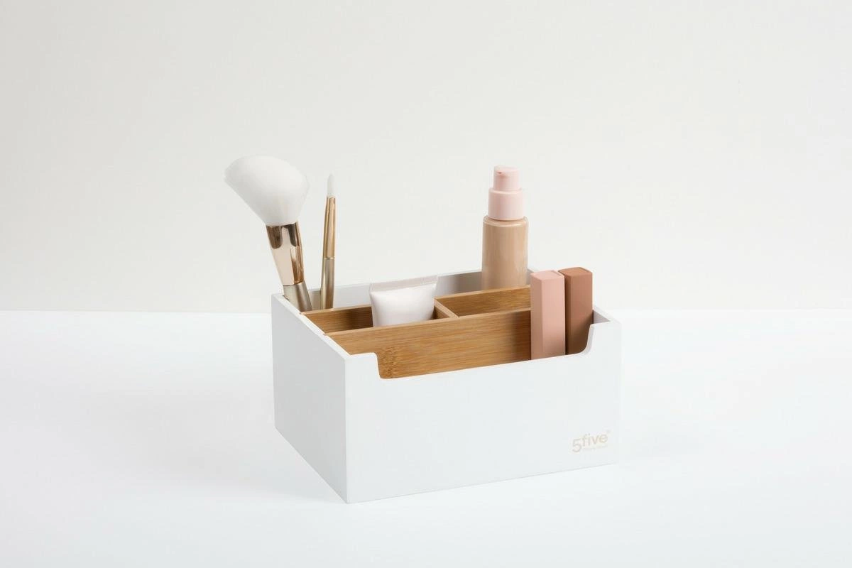 Organizer na kosmetyki Natureo marki 5five simply smart to praktyczny pojemnik do łazienki lub na toaletkę, wykonany z matowego bambusa w kolorze białym. Pięć starannie zaprojektowanych przegródek pozwala wygodnie posegregować kosmetyki do makijażu, pędzle, flakony czy akcesoria pielęgnacyjne. Kompaktowe wymiary (18,5 cm szerokości i 14,5 cm głębokości) sprawiają, że organizer zmieści się nawet na niewielkiej półce lub blacie, pomagając w utrzymaniu codziennej harmonii w Twoim otoczeniu.