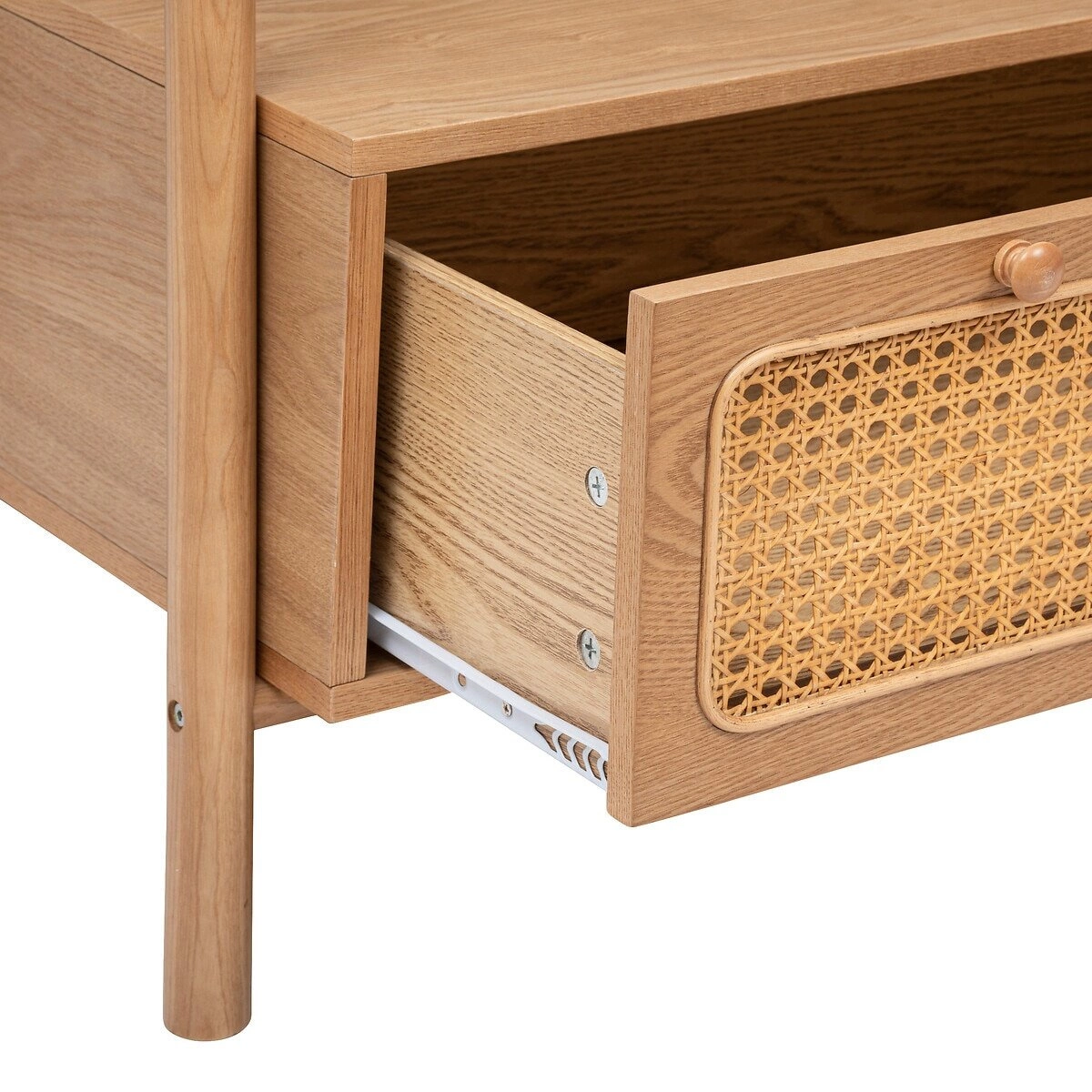 Wieszak Tiria to więcej niż klasyczny wieszak do przedpokoju – jest funkcjonalnym stojakiem na ubrania, który pozwoli Ci wygodnie powiesić kurtki, płaszcze czy torby. Drążek umieszczony na optymalnej wysokości ułatwia organizację odzieży wierzchniej, dzięki czemu poranki staną się bardziej uporządkowane. Dodatkowo, szeroka szuflada z rattanu to idealne miejsce na drobne akcesoria, buty lub czapki, które chcesz mieć zawsze pod ręką.
