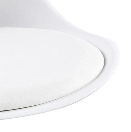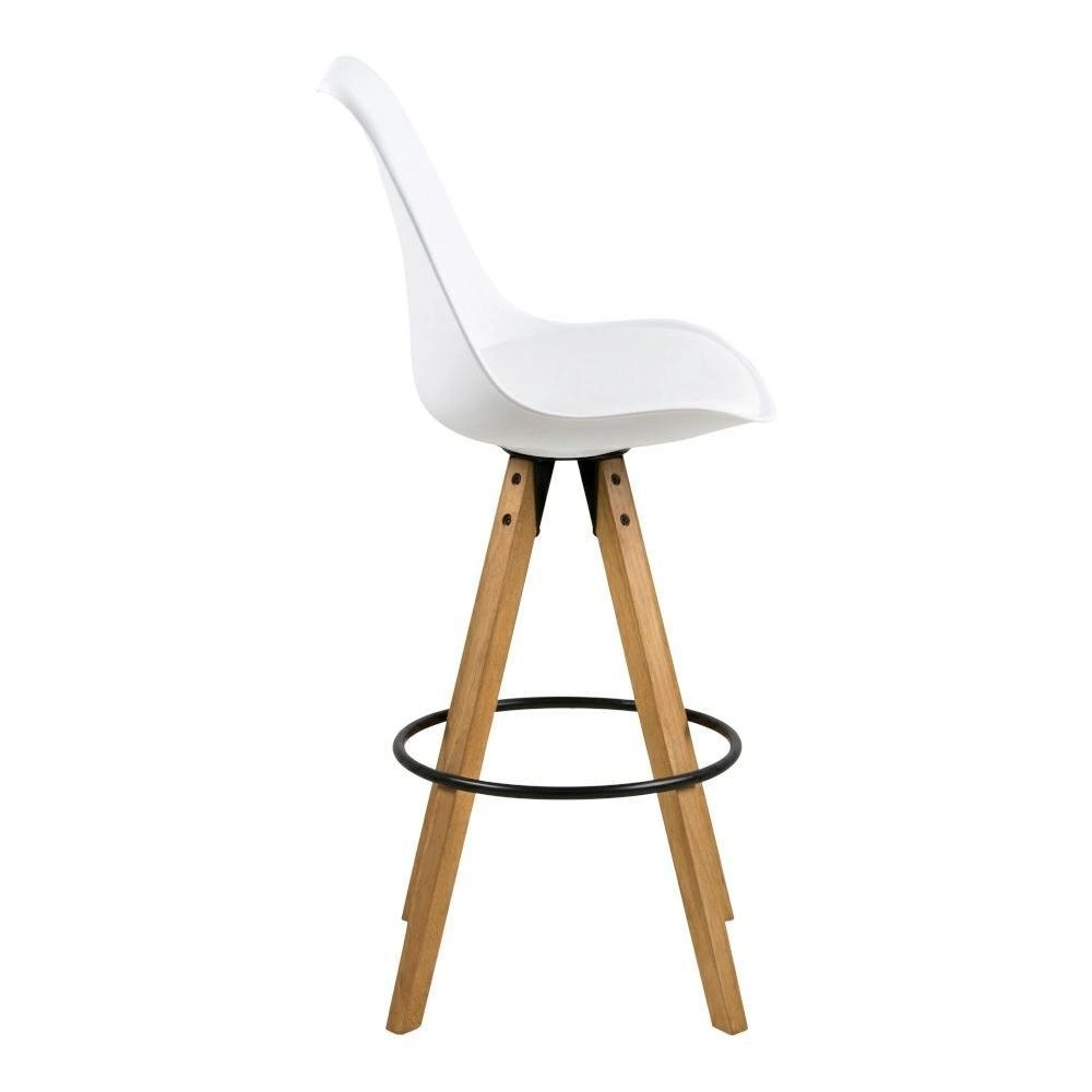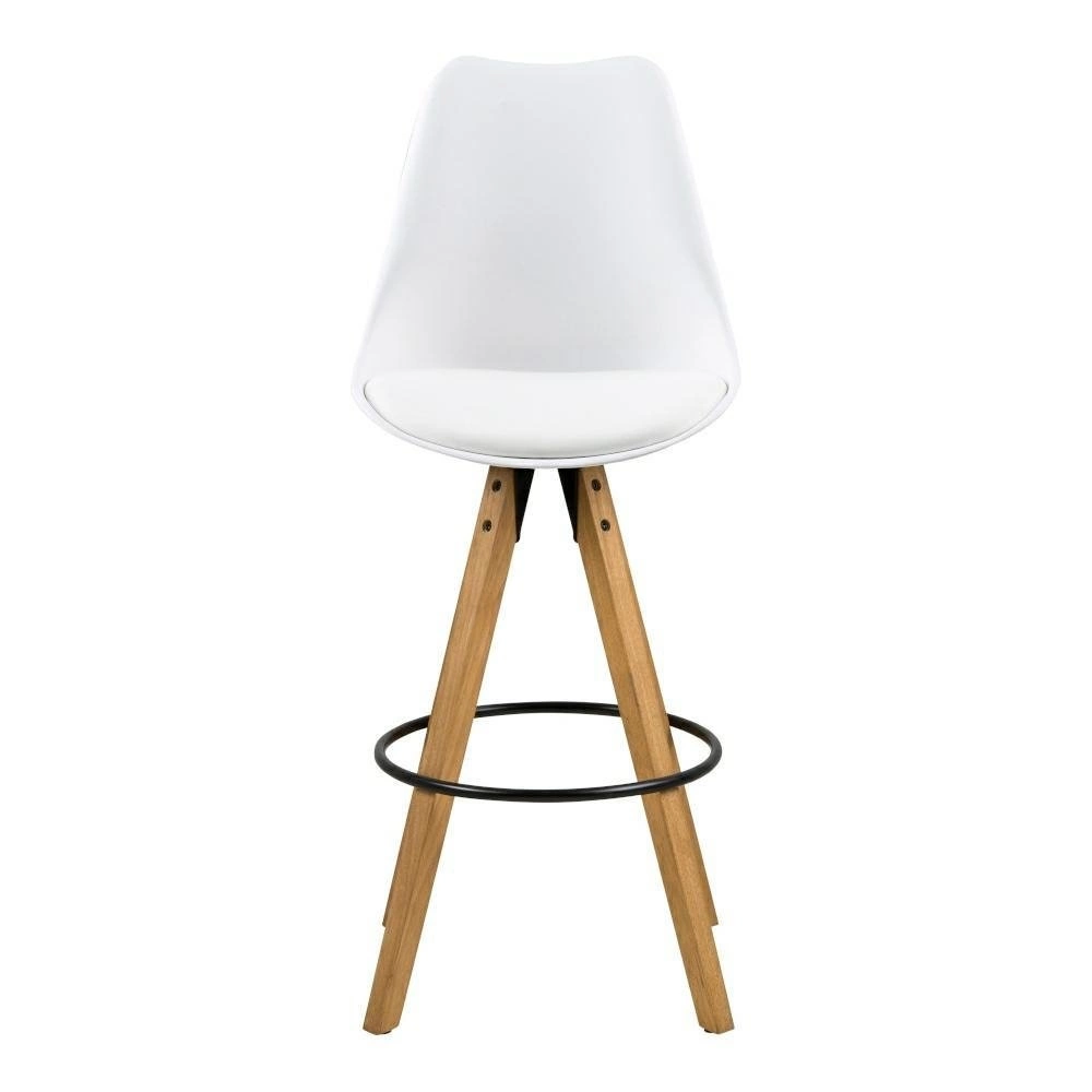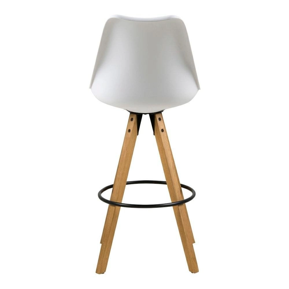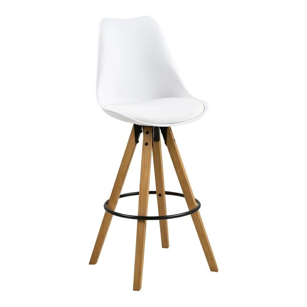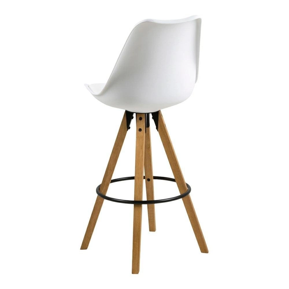 Praktyczny i komfortowy stołek barowy Dima. Wygodny stołek w stonowanej kolorystyce i nowoczesnym stylu ma obite białą eko skórą siedzisko i drewnianą podstawę. Siedzisko jest wymodelowane wraz z oparciem jako jeden element, z dodatkową poduszką również obitą eko skórą w białym kolorze. Podstawa w formie czwórnogu wykonana jest z listew z drewna kauczukowego, pobejcowanego na kolor dębu i zabezpieczonego olejem. Na dole nogi stołka objęte są czarnym metalowym relingiem pełniącym funkcję podpórki pod stopy. Całość będzie doskonale wyglądać w pubie lub jako siedzisko przy wyspie w kuchni. Waga: 7,75 kg.