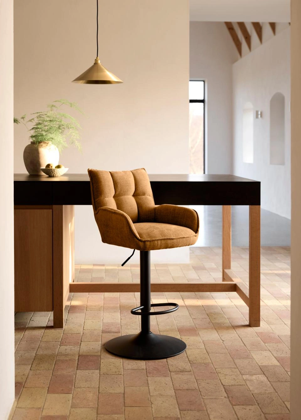 Hoker Marilla terracotta marki UNIQUE to nowoczesne krzesło barowe z oparciem i podłokietnikami, zaprojektowane z myślą o wyspie kuchennej i wysokim blacie w jadalni. Tapicerowane siedzisko w ciepłym odcieniu terracotta zestawiono z czarną, metalową podstawą na jednej nodze i praktycznym podnóżkiem. Regulowana wysokość pozwala wygodnie dopasować hoker do różnych blatów, a miękkie wypełnienie gwarantuje komfort nawet przy dłuższym siedzeniu.