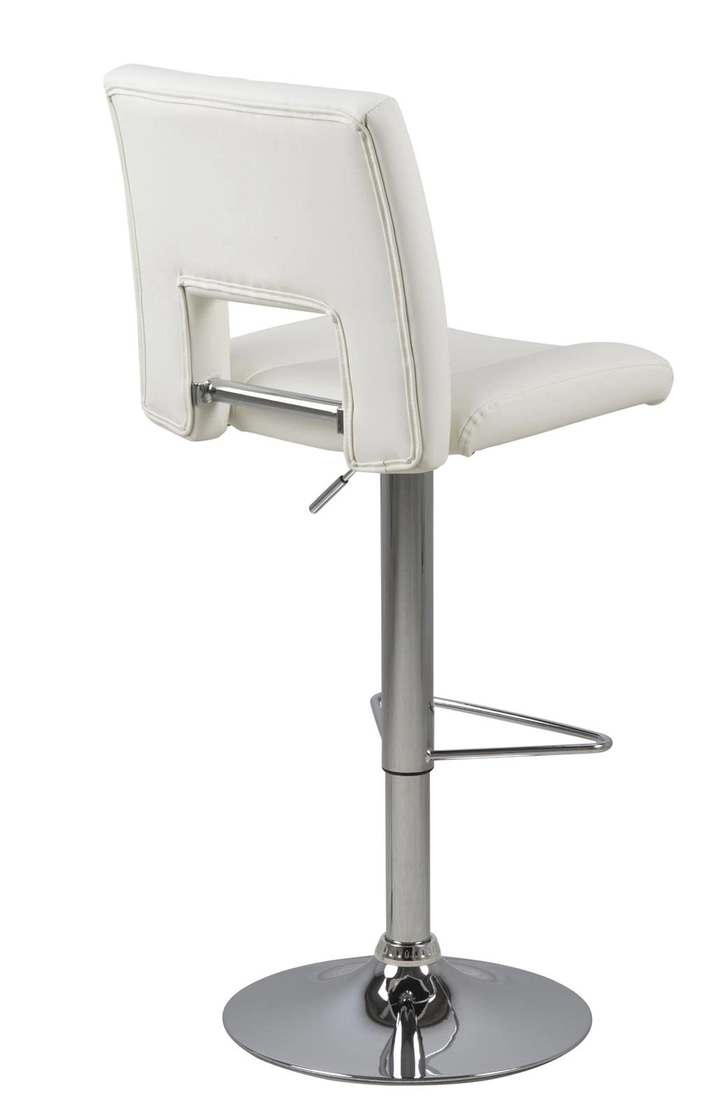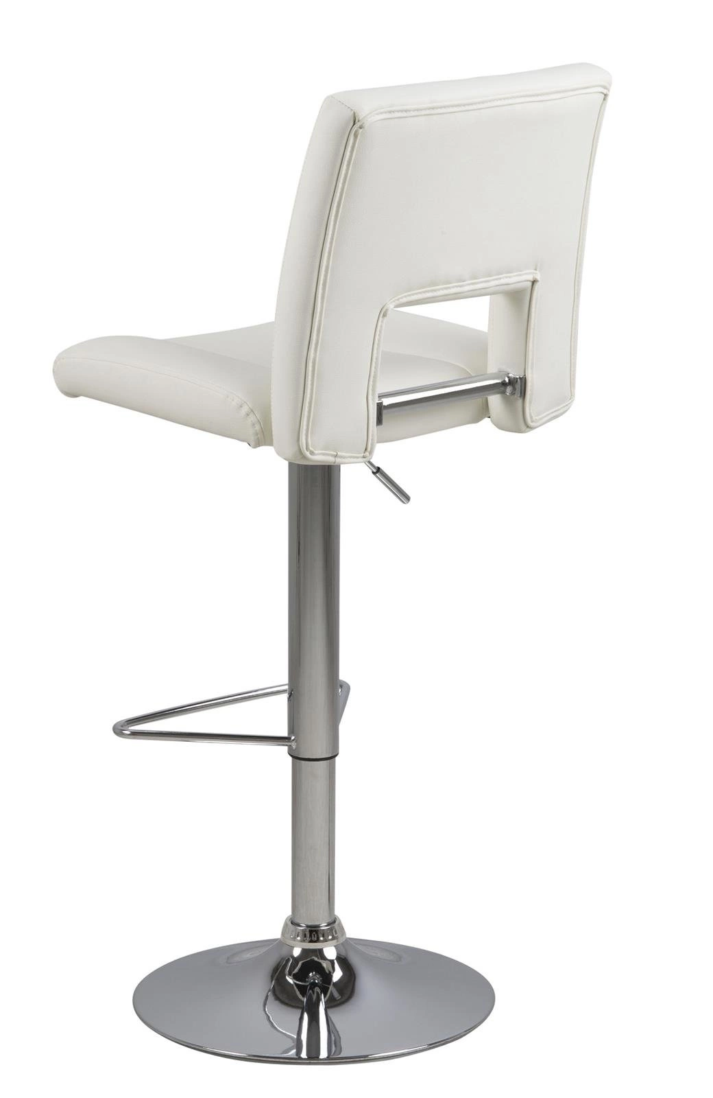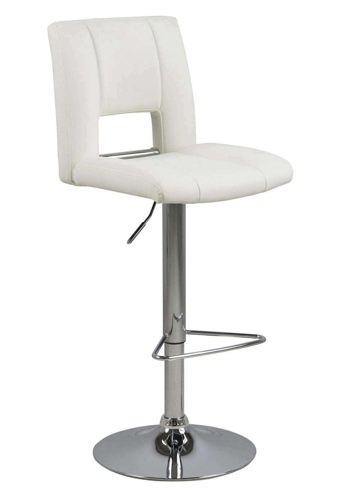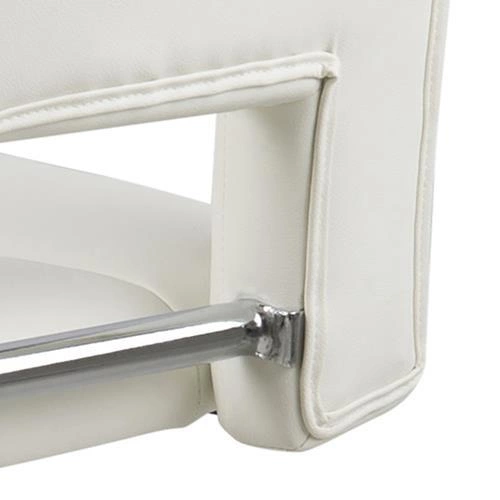Stołek barowy z oparciem to ostatnio najchętniej wybierany mebel do wyspy kuchennej. Nic dziwnego, hokery poza swoją funkcjonalnością dodają wnętrzom dobrego stylu i sprawiają, że pomieszczenie ma nowoczesny charakter. Hoker Sylvia to wiele korzyści w jednym produkcie. Jego siedzisko z wysokim oparciem wykonane zostało z pianki poliuretanowej, która zapewnia sprężystość i zapobiega odkształceniom. Powierzchnia wykończona została tapicerką z tkaniny PU leather look white WT1. Podstawę stanowi długa, smukła noga o chromowanym wykończeniu. Zakończona jest ona płaskim talerzem zapewniającym stabilność. Ogromną zaletą jest możliwość regulacji wysokości siedziska za pomocą automatycznego systemu. Poza tym hoker posiada też podparcie dla nóg, które poprawia komfort siedzenia przy wysokim blacie.