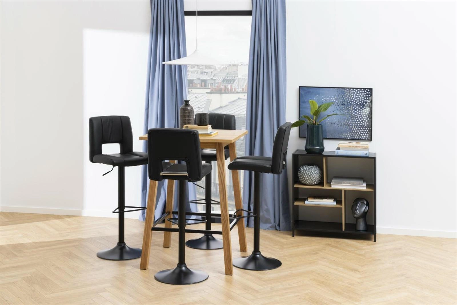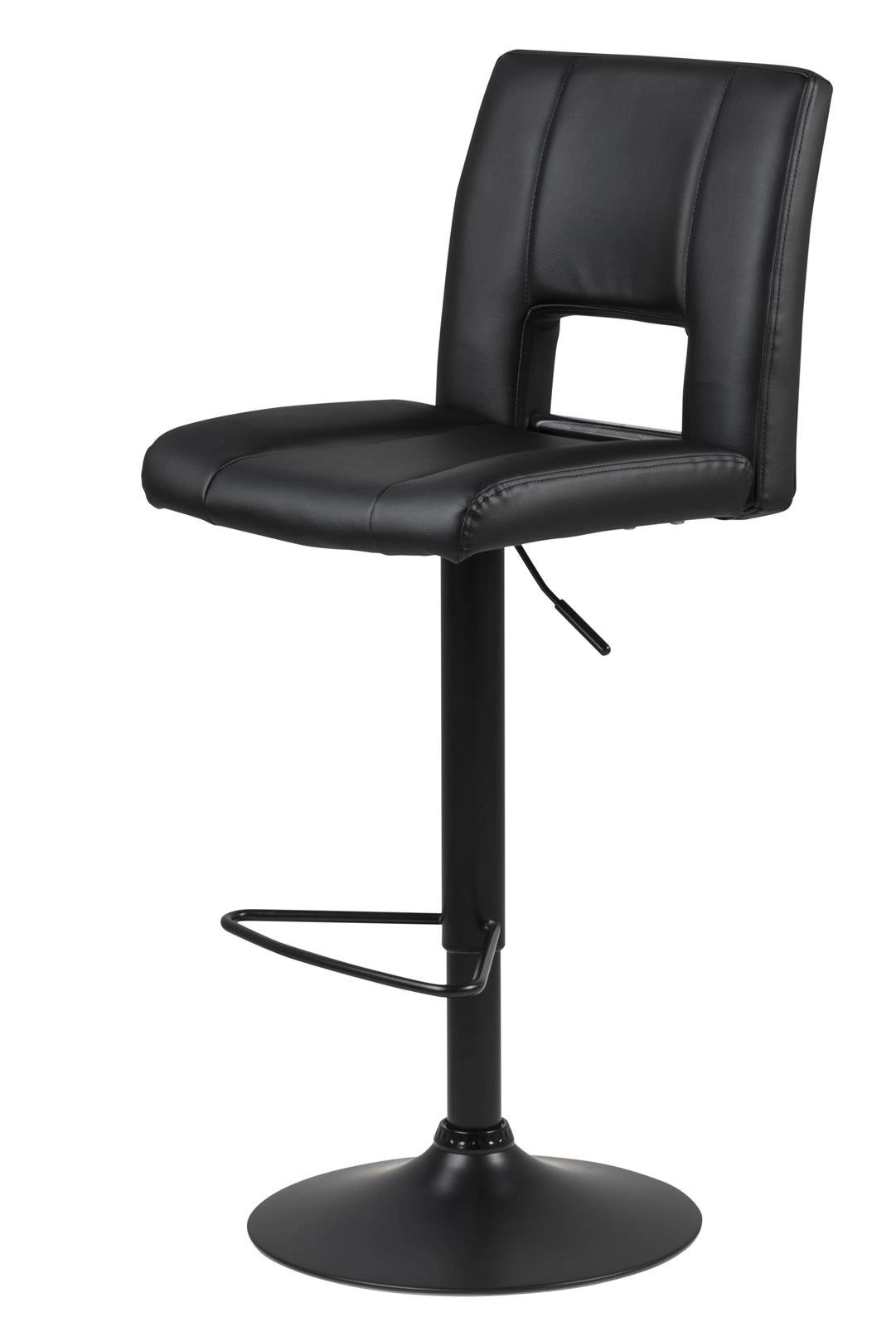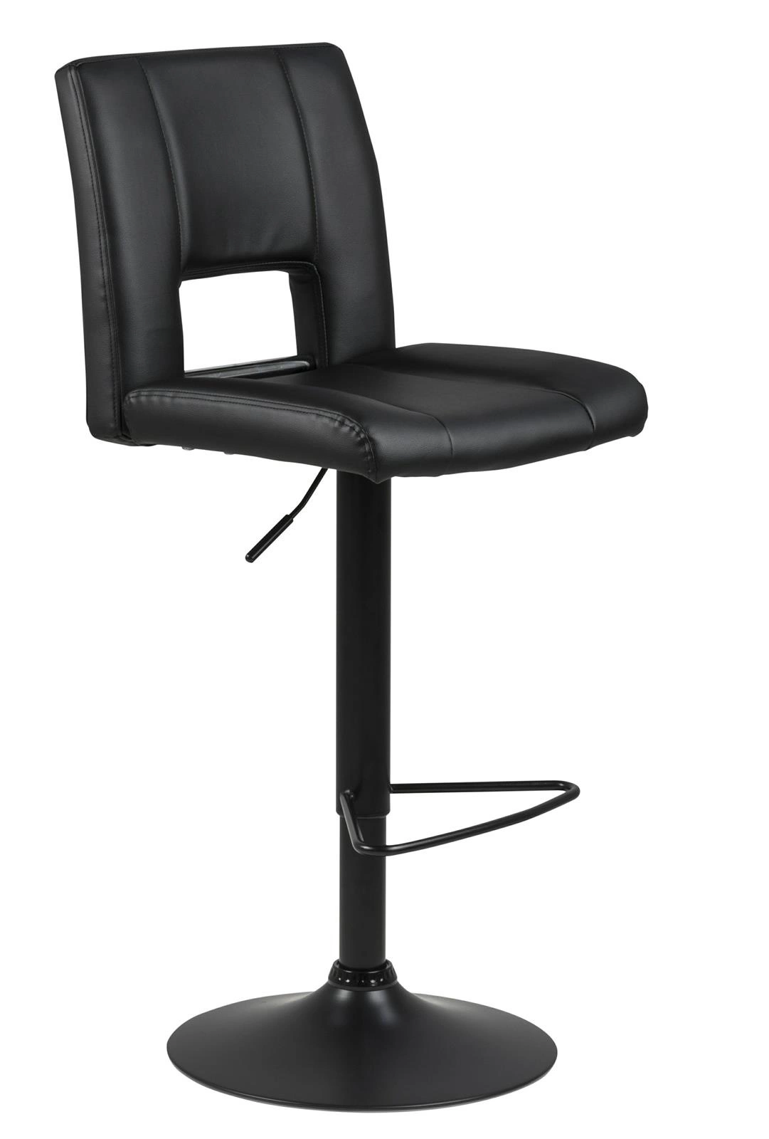 Stołek barowy z oparciem to ostatnio najchętniej wybierany mebel do wyspy kuchennej. Nic dziwnego, hokery poza swoją funkcjonalnością dodają wnętrzom dobrego stylu i sprawiają, że pomieszczenie ma nowoczesny charakter. Hoker Sylvia to wiele korzyści w jednym produkcie. Jego siedzisko z wysokim oparciem wykonane zostało z pianki poliuretanowej, która zapewnia sprężystość i zapobiega odkształceniom. Powierzchnia wykończona została tapicerką z tkaniny PU leather look black BK1. Podstawę stanowi długa, smukła noga w kolorze czarnym o matowym wykończeniu. Zakończona jest ona płaskim talerzem zapewniającym stabilność. Ogromną zaletą jest możliwość regulacji wysokości siedziska za pomocą automatycznego systemu. Poza tym hoker posiada też podparcie dla nóg, które poprawia komfort siedzenia przy wysokim blacie.