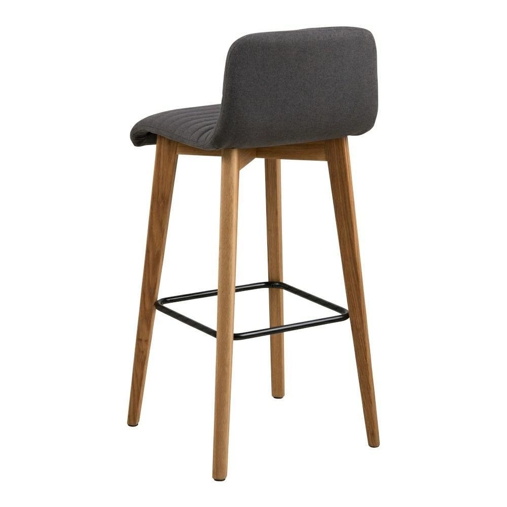 Nowoczesny stołek barowy Arosa jest kolejnym siedziskiem z serii Arosa. Tapicerowane siedzisko stołka zostało ozdobione poziomymi przeszyciami. Tkanina jaka została użyta to Granada kolor Anthracite 08. Podstawą stołka są olejowane dębowe nogi. Nogi dodatkowo zostały zabezpieczone metalowym pomalowanym na czarno podnóżkiem. Max. ilość szt. w kartonie: 2 Waga: 5,9 kg.