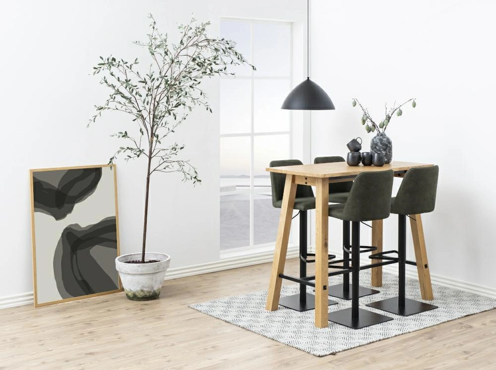 Stołek barowy Avanja to propozycja do modnych i wysokich wysp kuchennych lub barów. Hoker został zrobiony z tapicerowanego siedziska oraz metalowej podstawy. Materiał użyty na siedzisku to Preston fabric anthracite 96. Jest to wytrzymała tkanina w stonowanym uniwersalnym kolorze. Siedzisko zostało zrobione również z wyprofilowanego oparcia. Metalowa podstawa stolika została pomalowana proszkowo na czarno. Podstawa składa się z jednej nogi. Dużym plusem jest regulacja wysokości podstawy za pomocą uchwytu pod siedziskiem. Kolejnym plusem stołka jest podnóżek, dzięki któremu łatwo możemy usiąść na stołku oraz wygodnie możemy oprzeć nogi.
