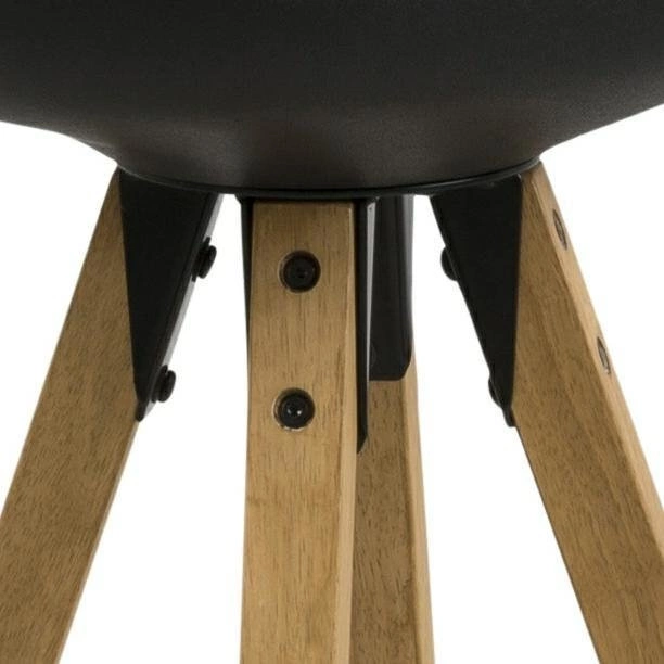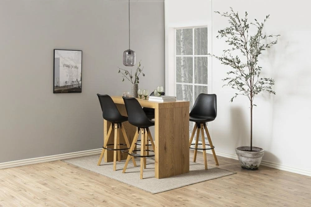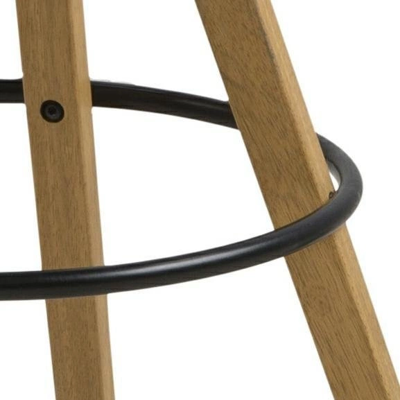 Praktyczny i komfortowy stołek barowy Dima. Wygodny stołek w stonowanej kolorystyce i nowoczesnym stylu ma obiteczarną eko skórą siedzisko i drewnianą podstawę. Siedzisko jest wymodelowane wraz z oparciem jako jeden element, z dodatkową poduszką również obitą eko skórą w czarnym kolorze. Podstawa w formie czwórnogu wykonana jest z listew z drewna kauczukowego, pobejcowanego na kolor dębu i zabezpieczonego olejem. Na dole nogi stołka objęte są czarnym metalowym relingiem pełniącym funkcję podpórki pod stopy. Całość będzie doskonale wyglądać w pubie lub jako siedzisko przy wyspie w kuchni. Waga: 7,75 kg.