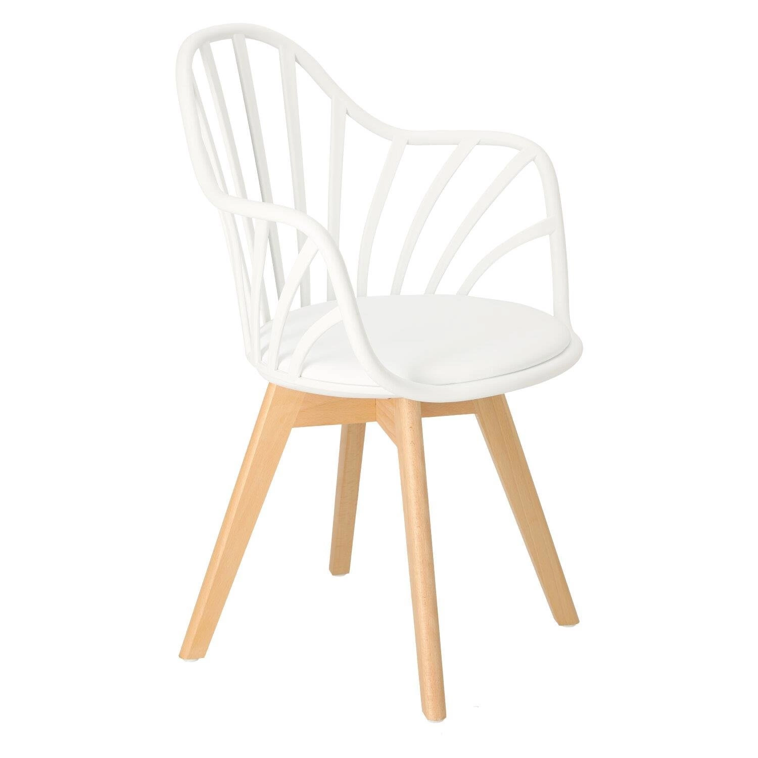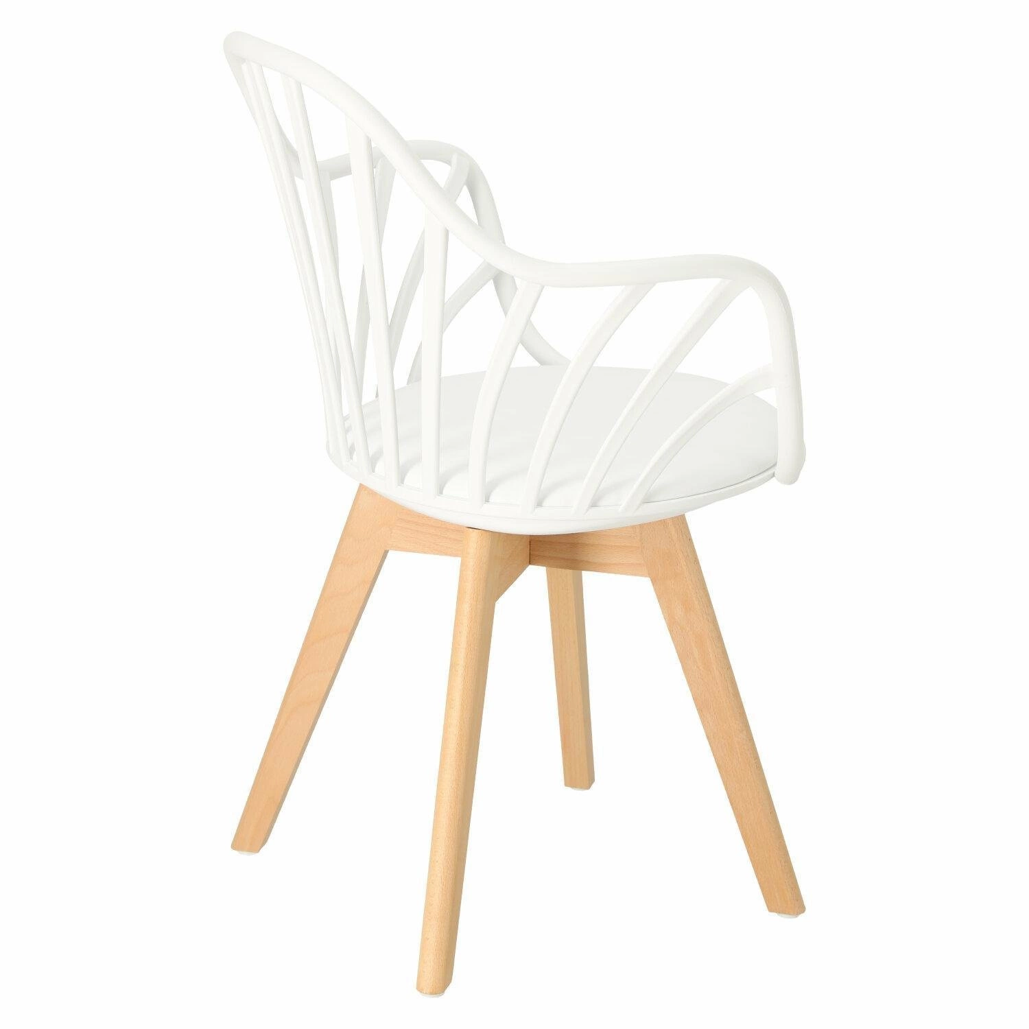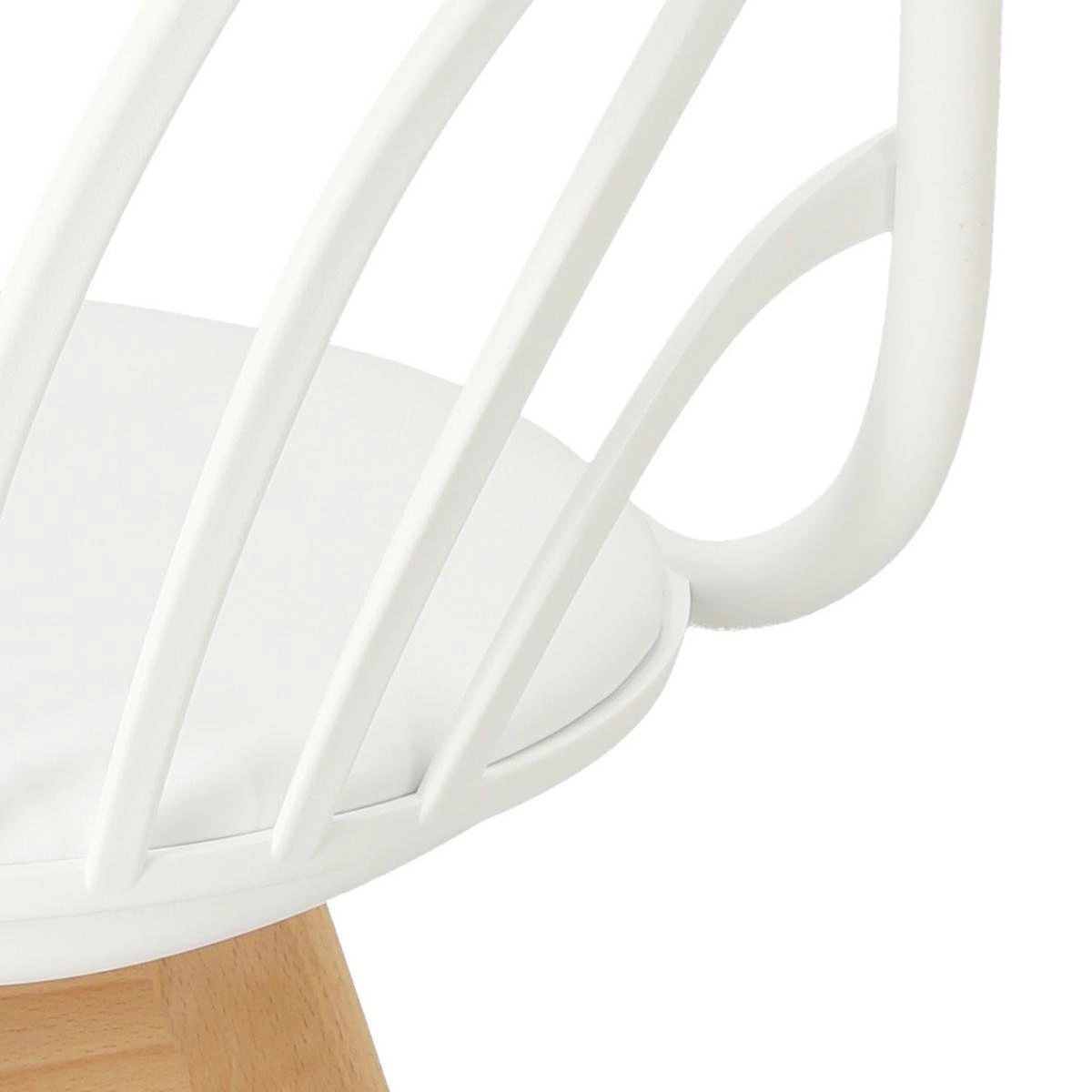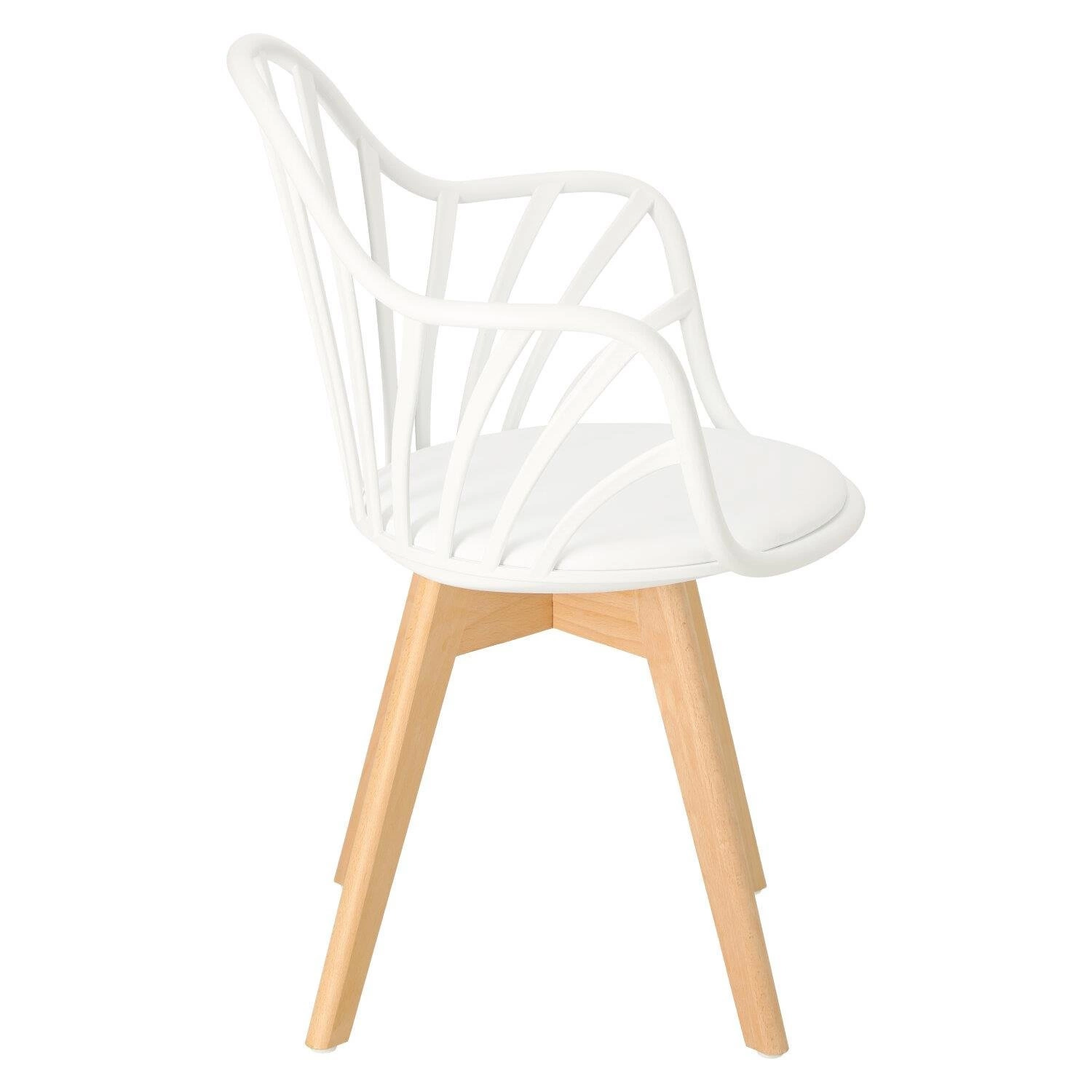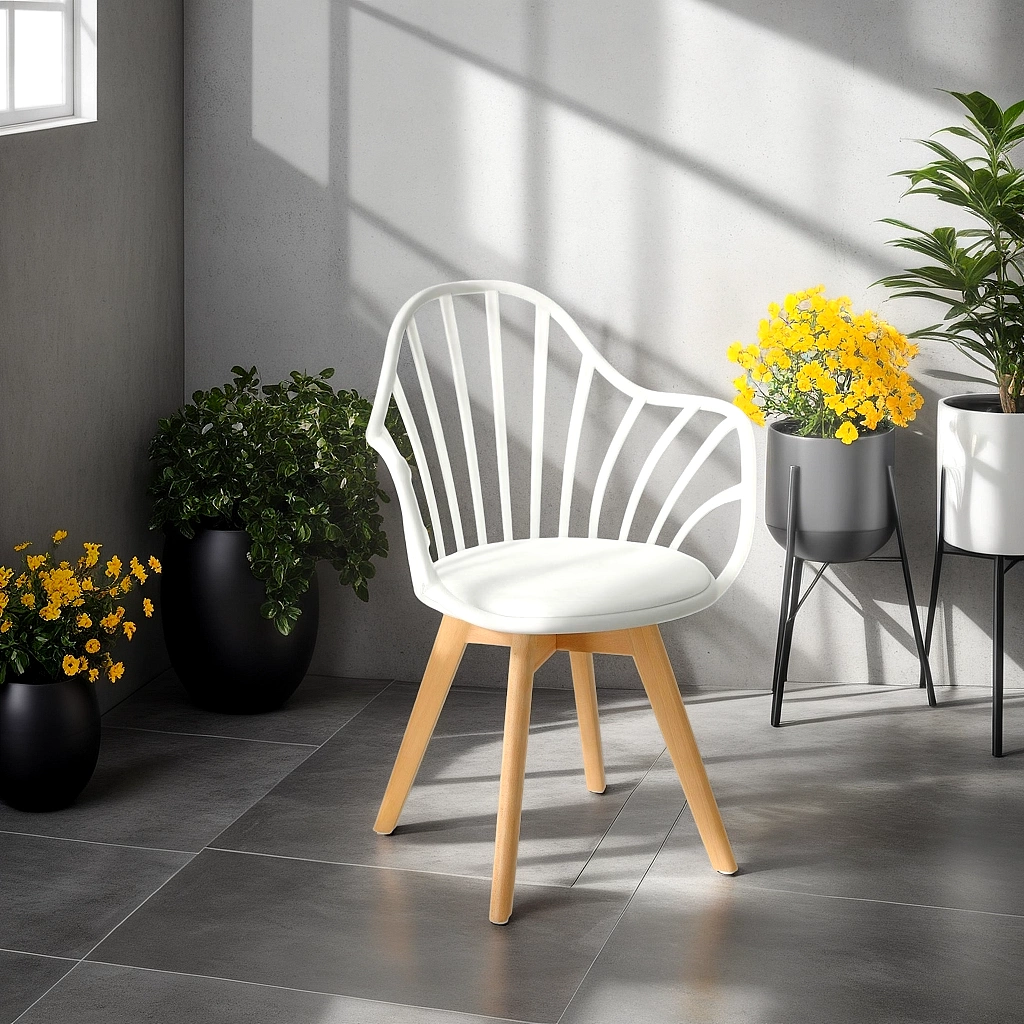 Krzesło Sirena będzie doskonale wyglądać we wnętrzach w stylu nowoczesnym i skandynawskim. Oparcie zostało wykonane z trwałego polipropylenu w kolorze białym, które dzięki specjalnym otworom zapewnia ciągłą wentylację. Materiał ten jest wyjątkowo wytrzymały na zmienne warunki i uszkodzenia mechaniczne. Jest także łatwy do utrzymania w czystości. Siedzisko jest wyposażone w miękką, wygodną poduszkę pokrytą eko skórą w kolorze białym. Wygodne podłokietniki stanowią jeden z największych atutów tego krzesła - pozwalają na swobodne ułożenie rąk podczas siedzenia. Nogi wykonane z drewna bukowego zapewniają trwałość na lata - są odporne na uszkodzenia mechaniczne. Mebel sprawdzi się świetnie w jadalni czy jako krzesło biurowe. Dzięki swojej nieoczywistej formie stanie się dodatkową dekoracją wnętrza.