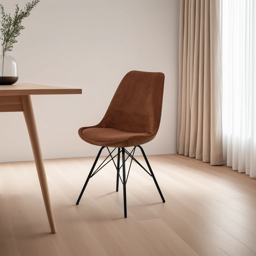 Szukasz rozwiązań, które łączą w sobie funkcjonalność i elegancję? Krzesło Eris Sztruks to mebel, który wyróżnia wyjątkowa lekkość i delikatność formy. Jego profilowane siedzisko posiada subtelnie zaokrąglone krawędzie, które pozwalają na wysoki komfort użytkowania. Dzięki temu bez problemu będziesz mógł spędzić na nim długie godziny przy rodzinnym stole lub podczas pracy przy biurku. Stworzona z polipropylenu forma pokryta została tkaniną Wind Cooper 100, która jest niezwykle miła w dotyku, a dodatkowo przez sztruksową tkaninę prążkowaną daje ciekawy efekt wizualny. Subtelność tego wygodnego krzesła podkreśla metalowa podstawa malowana proszkowo w odcieniu eleganckiej czerni. Pomiędzy 4 nogami znajdują się dodatkowe wsporniki, które sprawiają, że konstrukcja jest stabilna i wytrzymała, przez co może unieść do 120 kg.