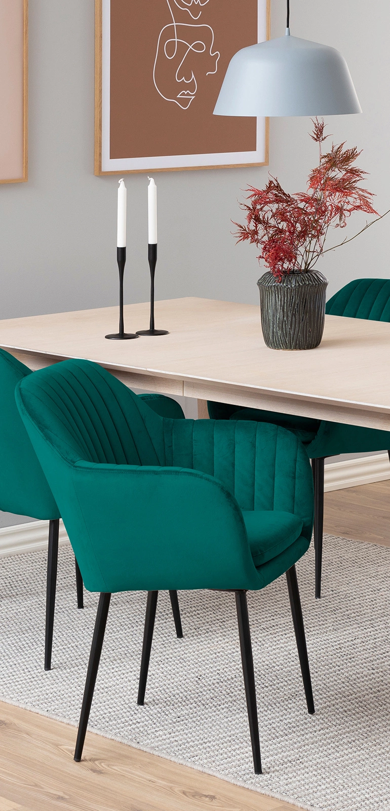 Seria EMILIA VELVET to niezwykle efektowna kolekcja, która odzwierciedla istotę uwielbianego na całym świecie stylu skandynawskiego. Stylistyka scandi łączy ze sobą elementy naturalne takie jak drewno z eleganckimi, przyjemnymi w dotyku materiałami. Tapicerowane siedzisko krzesła EMILIA VELVET zostało wykonane z najwyższej jakości tkaniny VIC. Aby wpasować się w aktualne trendy wnętrzarskie, zastosowano tkaninę o wykończeniu welurowym, dodatkowo podkreśloną estetycznym pikowaniem w postaci pionowych szwów. Siedzisko z podłokietnikami w doskonały sposób zadba o nasz komfort podczas pracy lub spożywanego posiłku. Podstawa to cztery metalowe nogi pomalowane na kolor czarny, które idealnie komponują się z intensywną głębią dostępnej kolorystyki krzeseł EMILIA VELVET.