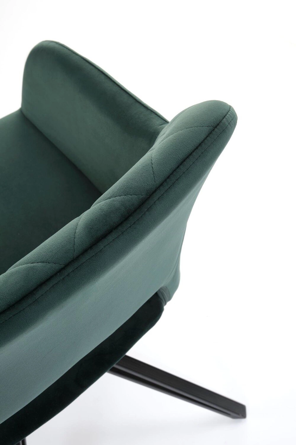 Krzesło obrotowe Cretas Velvet zielony ciemny to połączenie luksusu, wygody i nowoczesnego designu, które doskonale sprawdzi się w różnych aranżacjach wnętrz. Wykonane z wysokiej jakości tkaniny velvetowej w eleganckim ciemnozielonym kolorze (BLUVEL 78) oraz wyposażone w cztery stabilne, czarne nogi malowane proszkowo, krzesło to emanuje stylem i trwałością. Nogi krzesła są zabezpieczone od spodu, co chroni podłogę przed uszkodzeniami, zapewniając jednocześnie stabilność mebla. Szerokie kubełkowe siedzisko z ozdobnymi pikowaniami na oparciu oraz podłokietniki gwarantują komfort użytkowania, a otwór między siedziskiem a oparciem zapewnia cyrkulację powietrza, co jest szczególnie przydatne podczas długiego użytkowania.