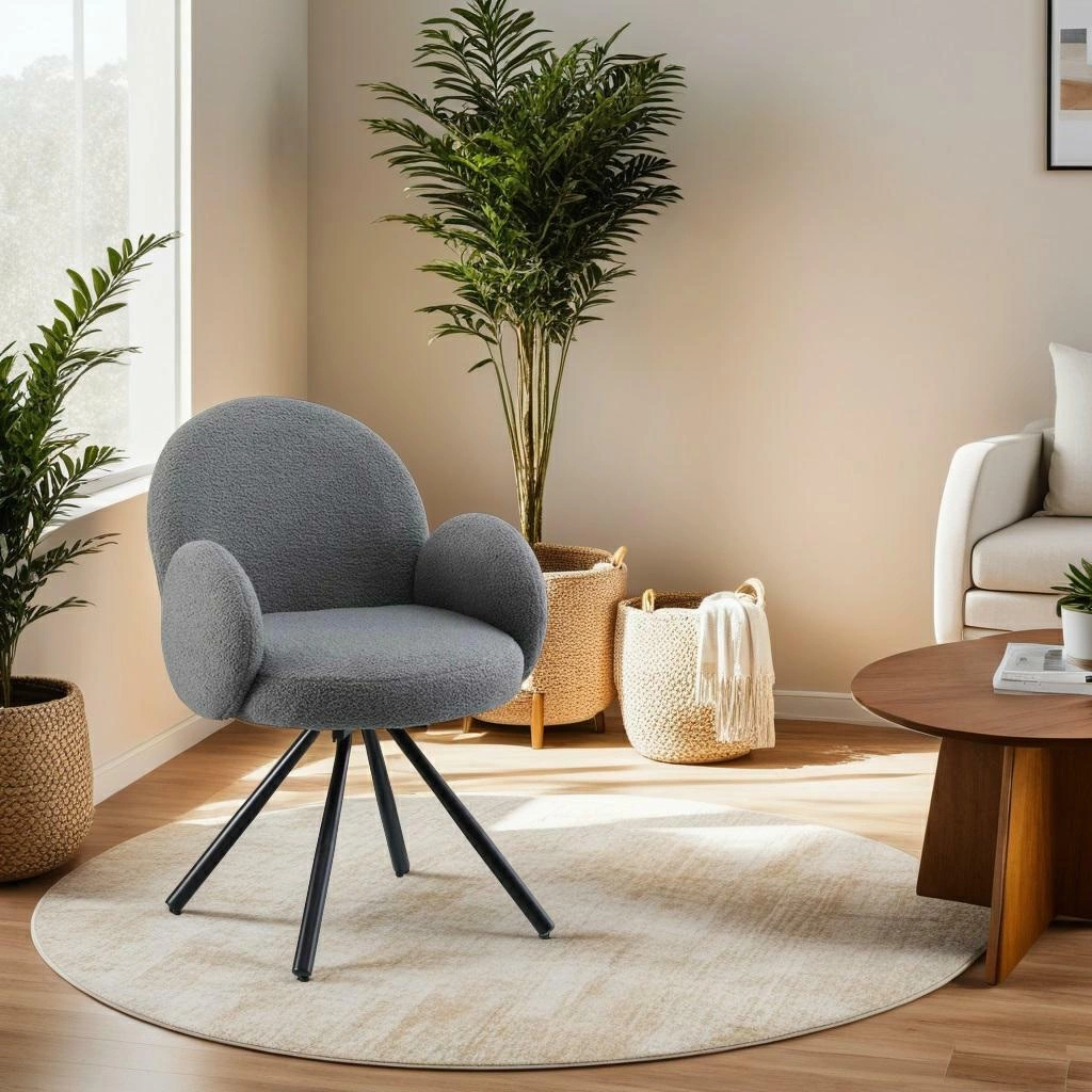 - Krzesło wykonane jest z tkaniny bouclé i proszkowo malowanej stali, co gwarantuje jego trwałość i wytrzymałość.