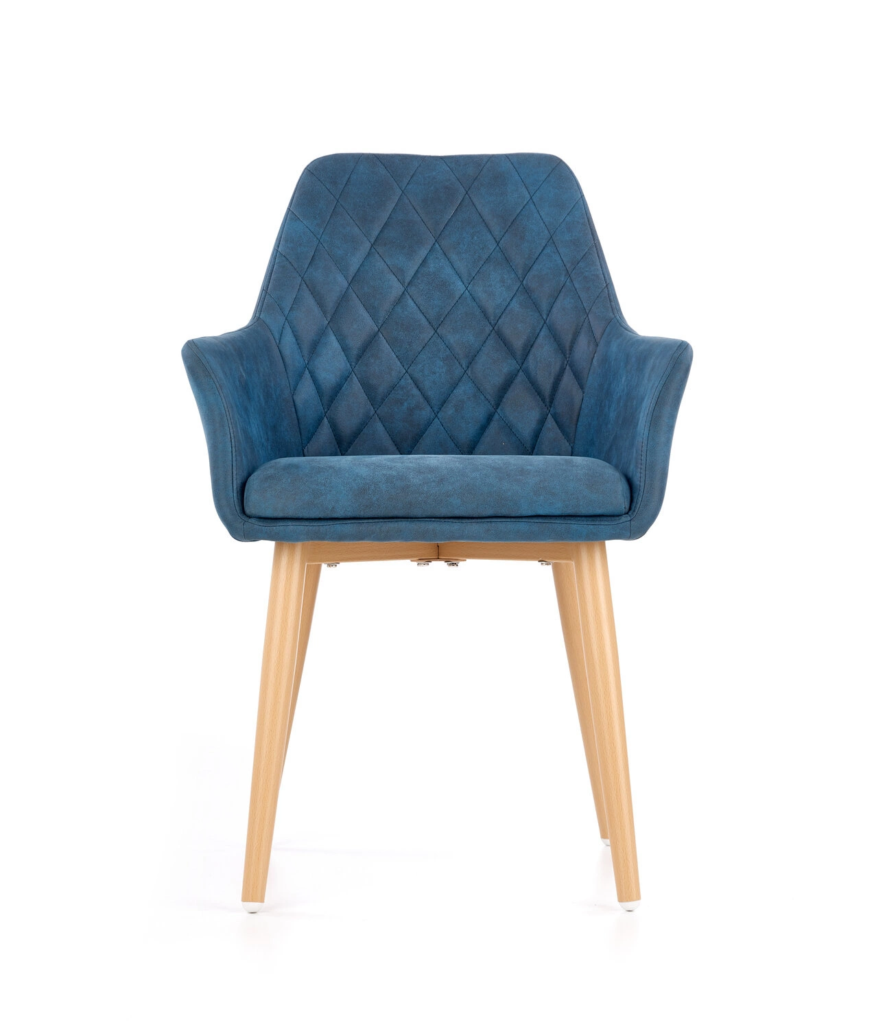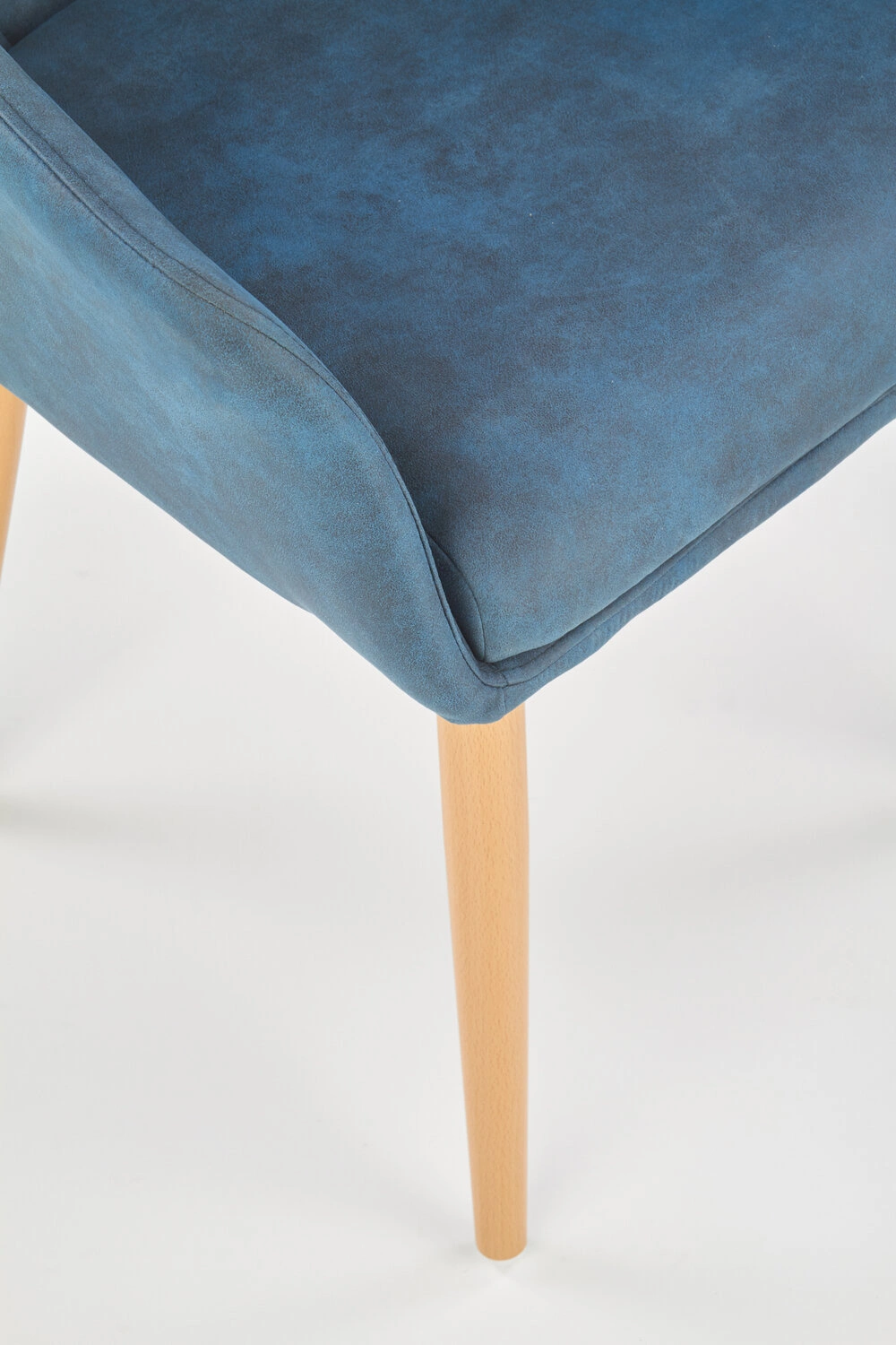 Massal to krzesło tapicerowane stworzone z myślą o miłośnikach współczesnego stylu. Charakterystyczne, miękkie siedzisko pokryte granatową ekoskórą przyciąga uwagę głębią koloru i subtelnym połyskiem. Podstawa wykonana ze stali, wykończona na wzór naturalnego drewna, podkreśla lekkość formy i nadaje całości wyrafinowany wygląd. Dzięki niewielkim rozmiarom – szerokość 58 cm, głębokość 61 cm oraz wysokość całkowita 85 cm – krzesło z łatwością wkomponuje się zarówno w przestronną jadalnię, jak i przytulną kuchnię.