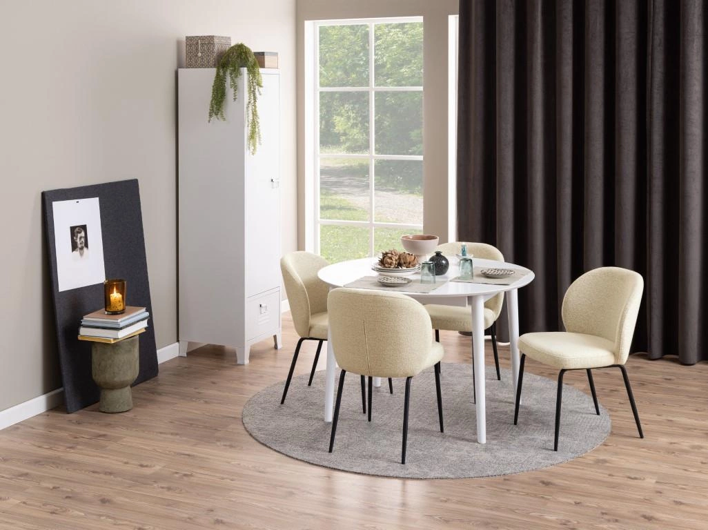 Tapicerowane krzesło Patricia posiada siedzisko oraz oparcie pokryte gęstą pianką poliuretanową. Jest to materiał, który wyróżnia bardzo dobra trwałość oraz odporność na odkształcenia i uszkodzenia. Dzięki temu krzesło posiada idealną twardość i sprężystość, tym samym dając użytkownikom długotrwałą wygodę. Tak samo, jak tapicerka wykonana z tkaniny Monza fabric cream 90. Podstawę krzesła stanowią cztery metalowe nogi malowane proszkowo na kolor czarny. Wykorzystane materiały pozwalają wykorzystać krzesło tapicerowane Patricia w jadalni, restauracji czy sali konferencyjnej.