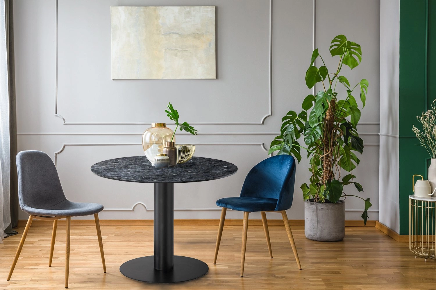 Wilma to zgrabne, bardzo nowoczesne krzesło. Charakteryzuje je ciekawa tkanina Sawana light grey 21, którą zostało obite. Siedzisko oraz oparcie są lekko wyprofilowane, aby zapewnić jak najwygodniejszą pozycję do siedzenia. Podstawą krzesła są metalowe nogi w okleinie przypominającej strukturę drewna dębu. Waga krzesła to tylko 5,48 kg Maksymalne obciążenie: 120 kg