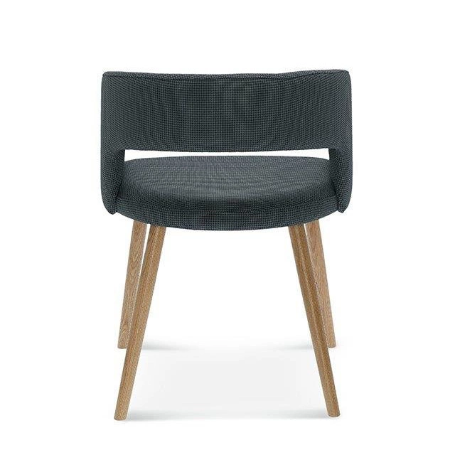 Krzesło z podłokietnikami Fameg Cube to ciekawy model o modernistycznym wyglądzie. Do jego produkcji użyto drewna dębowego, posiada ono tapicerowane, ażurowe oparcie oraz wygodne siedzisko. Okrągłe nogi krzesła delikatnie rozchodzą się na boki, co zapewnia mu lepszą stabilność. To idealny wybór dla osób ceniących sobie design w połączeniu z trwałością.