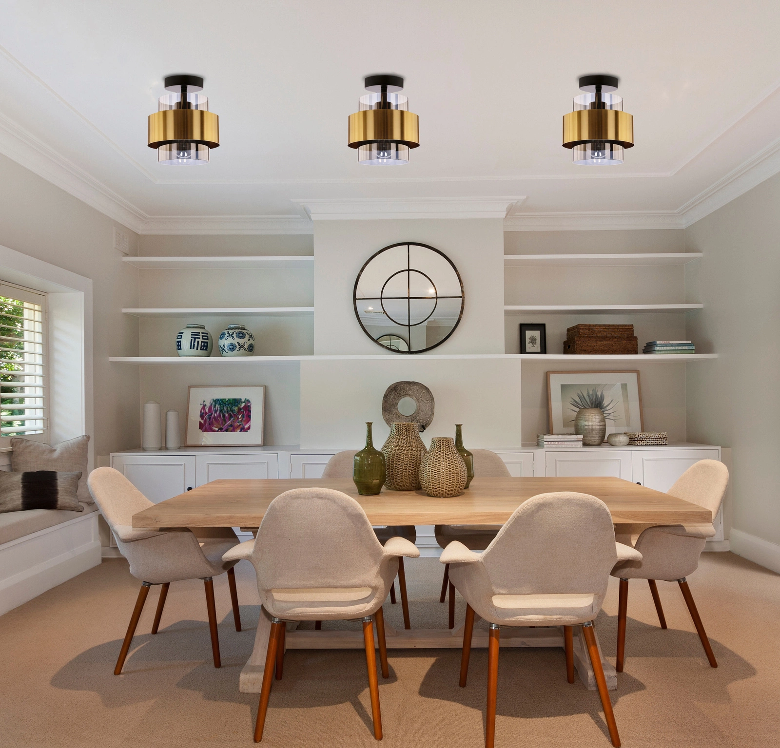 - Nowoczesny design lampy sufitowej Spiega, wzbogacony o mosiężne detale, doskonale komponuje się z nowoczesnymi wnętrzami