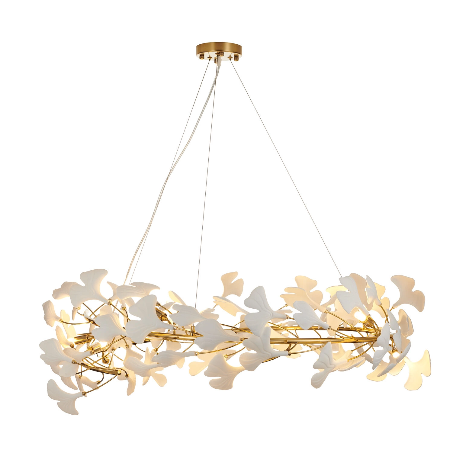 Prezentowana lampa wisząca BOTANIKA to wyjątkowe połączenie elegancji i stylu. Inspiracją do jej stworzenia były naturalne, roślinne kształty, które znalazły odzwierciedlenie w formie białych ceramicznych listków. Listki te nawiązują do liści Ginkgo, a ich matowe wykończenie dodaje lampie subtelności i lekkości. Stelaż lampy wykonany jest z metalu w kolorze polerowanego złota, co podkreśla jej luksusowy charakter. Lampa BOTANIKA to nie tylko źródło światła, ale przede wszystkim niezwykle dekoracyjny element wnętrza, który przyciąga wzrok i dodaje pomieszczeniu wyjątkowego charakteru.
