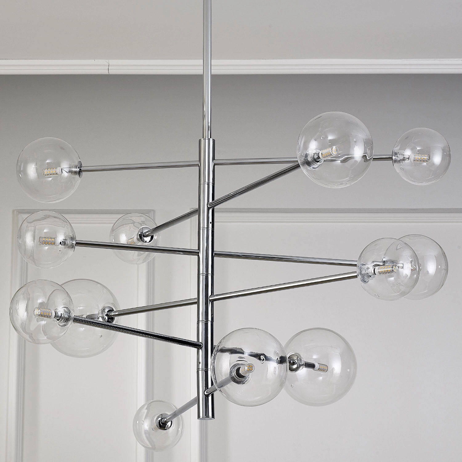 Lampa wisząca SOLA została zaprojektowana z myślą o współczesnych aranżacjach, w których liczy się zarówno forma, jak i funkcjonalność. Transparentne, szklane klosze rozmieszczone na rozłożystej konstrukcji w kolorze chromu tworzą przyciągający wzrok efekt wizualny i rozpraszają światło w przyjemny sposób. Tak zaprojektowana lampa nad stół podkreśli charakter nowoczesnego salonu, doda blasku przestronnej jadalni, a nawet urozmaici sypialnię lub domowe biuro.