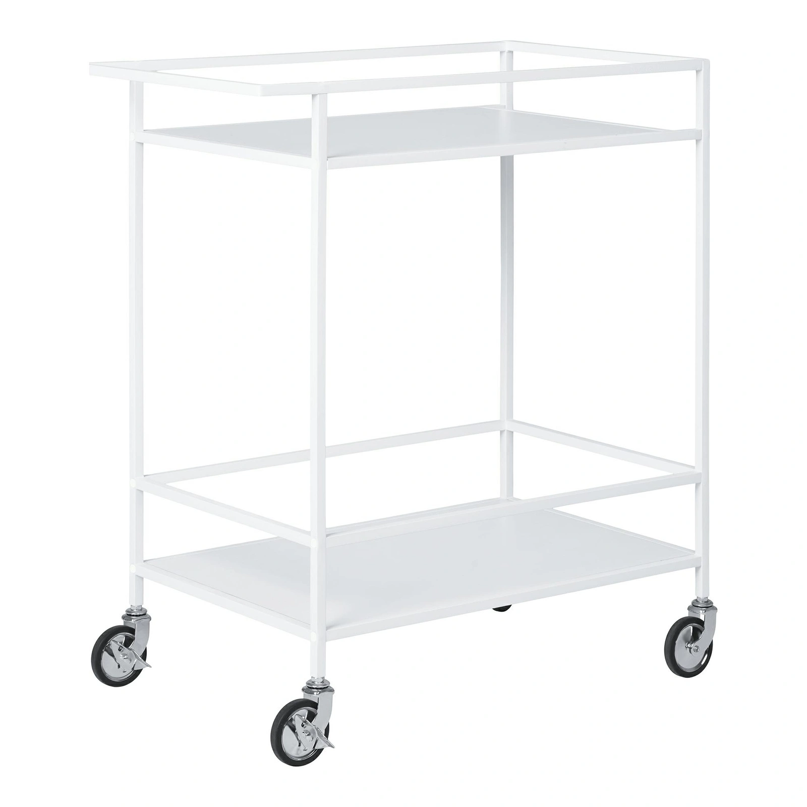 Wózek barowy Vita marki House Nordic to nowoczesny stolik mobilny na kółkach, wykonany ze stali i laminowanej płyty w eleganckim białym kolorze. Dzięki dwupoziomowej konstrukcji, prostokątnym blatom 68 × 40 cm oraz wysokości 79 cm, idealnie sprawdzi się jako praktyczny wózek do serwowania w kuchni, jadalni lub salonie.