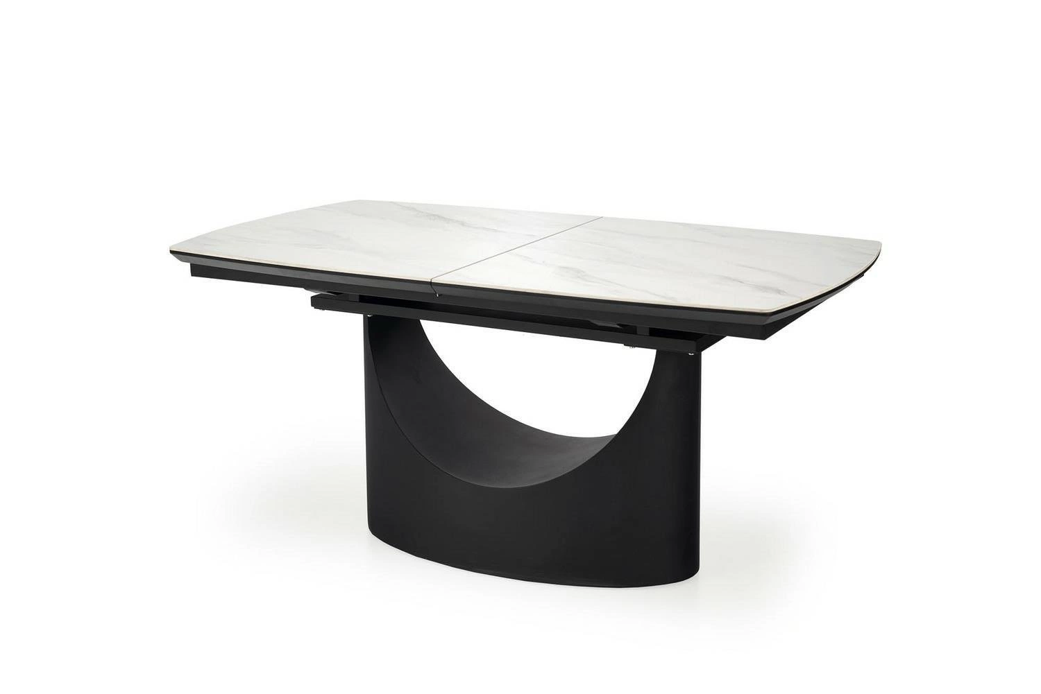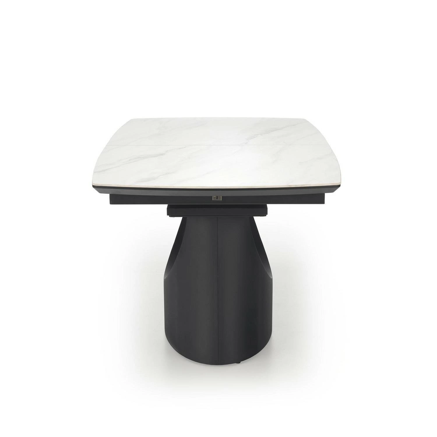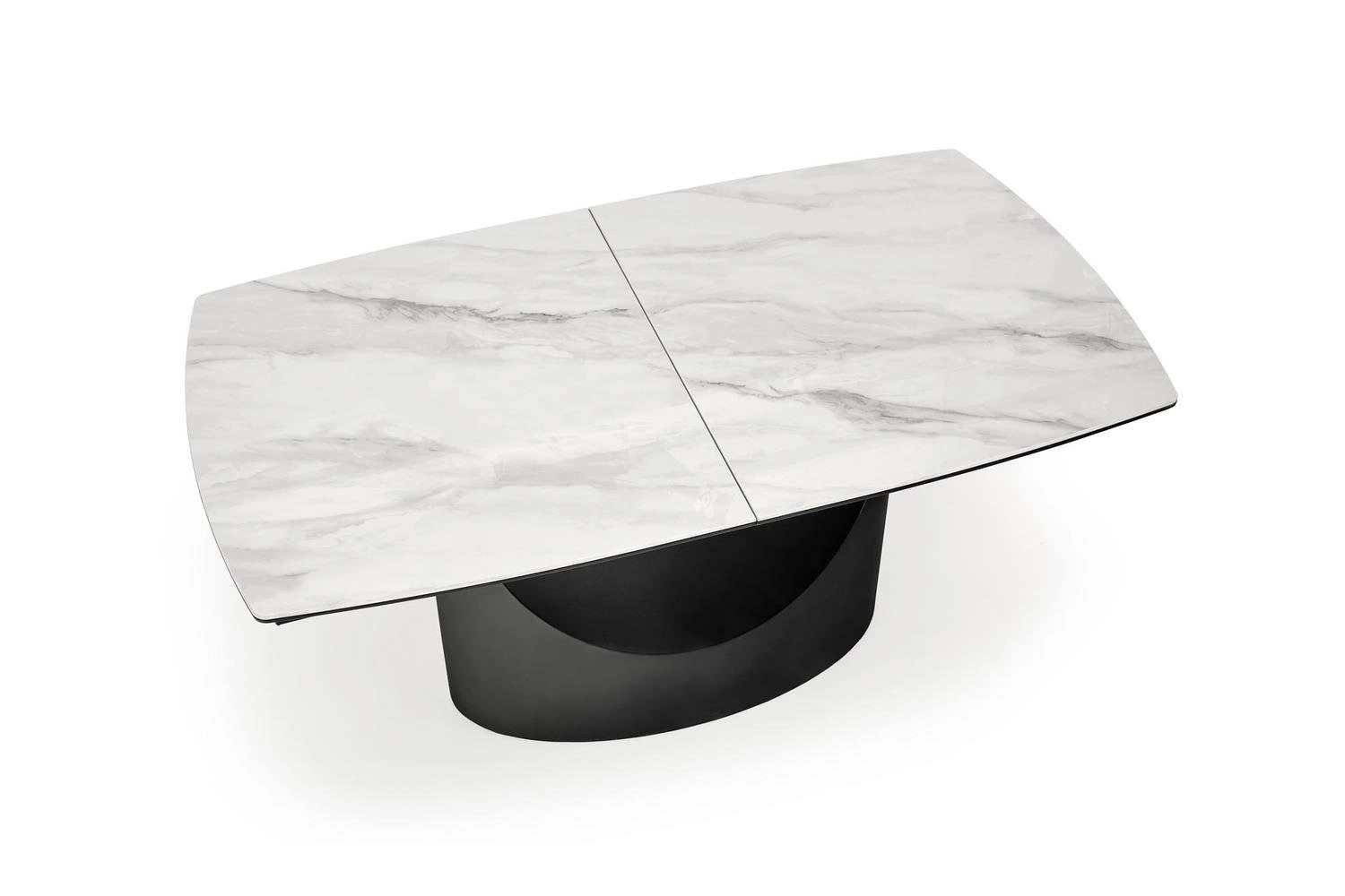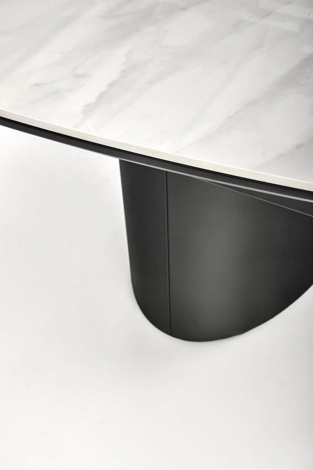 Został wykonany z wysokiej jakości materiałów, takich jak ceramika, MDF lakierowany oraz stal malowana proszkowo, co gwarantuje jego trwałość oraz odporność na uszkodzenia. Blat stołu w kolorze białego marmuru i czarnym, w połączeniu z nogą w kolorze czarnym, nadaje mu eleganckiego i nowoczesnego wyglądu.Dzięki prostokątnemu kształtowi blatu oraz jednej nodze, stół Demin zajmuje niewiele miejsca, co jest szczególnie ważne w przypadku mniejszych pomieszczeń.