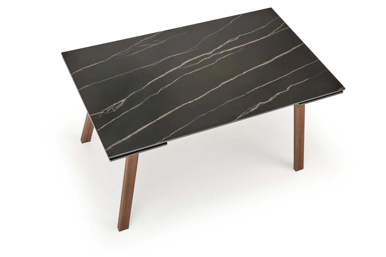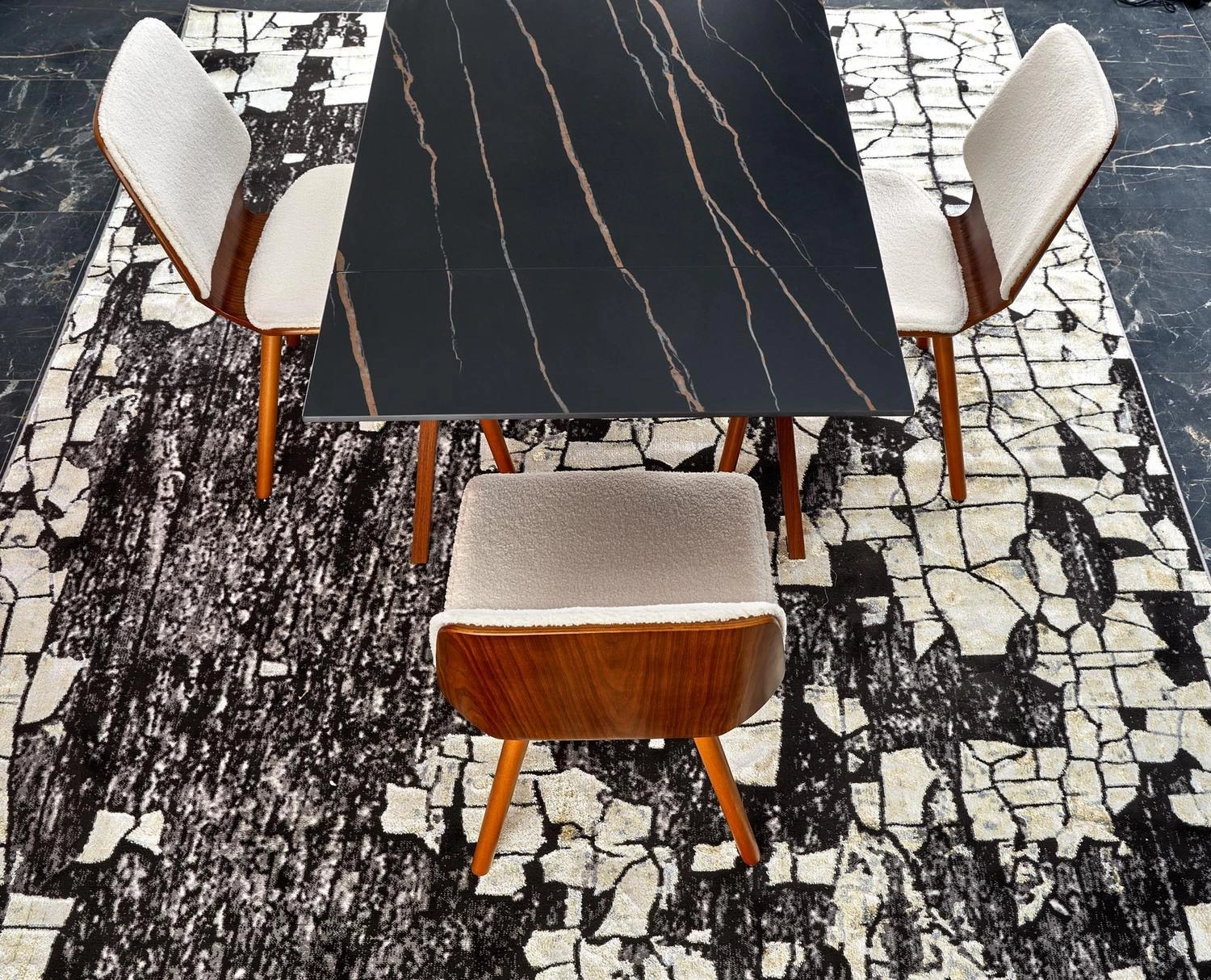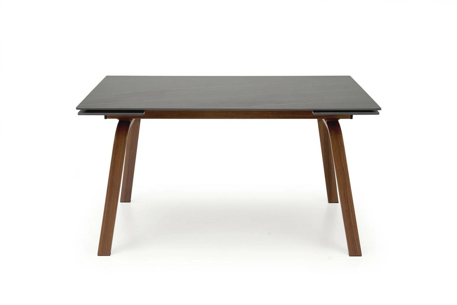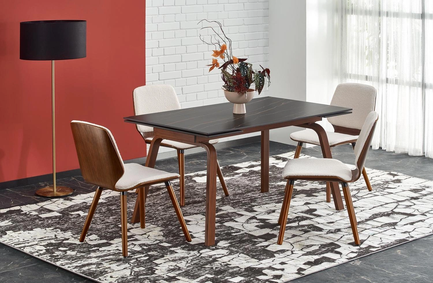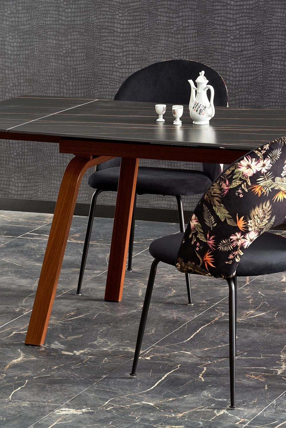 Stół został wykonany z wysokiej jakości materiałów, takich jak spiek oraz stal malowana proszkowo, co gwarantuje trwałość oraz odporność na uszkodzenia. Blat w kolorze czarnego marmuru oraz nogi w orzechowym odcieniu, tworzą niepowtarzalny design, który z pewnością zachwyci każdego miłośnika nowoczesnego stylu. Wysokość stołu wynosi 76 cm, co umożliwia wygodne siedzenie przy nim. Stelaż z metalu zapewnia stabilność oraz bezpieczeństwo użytkowania.