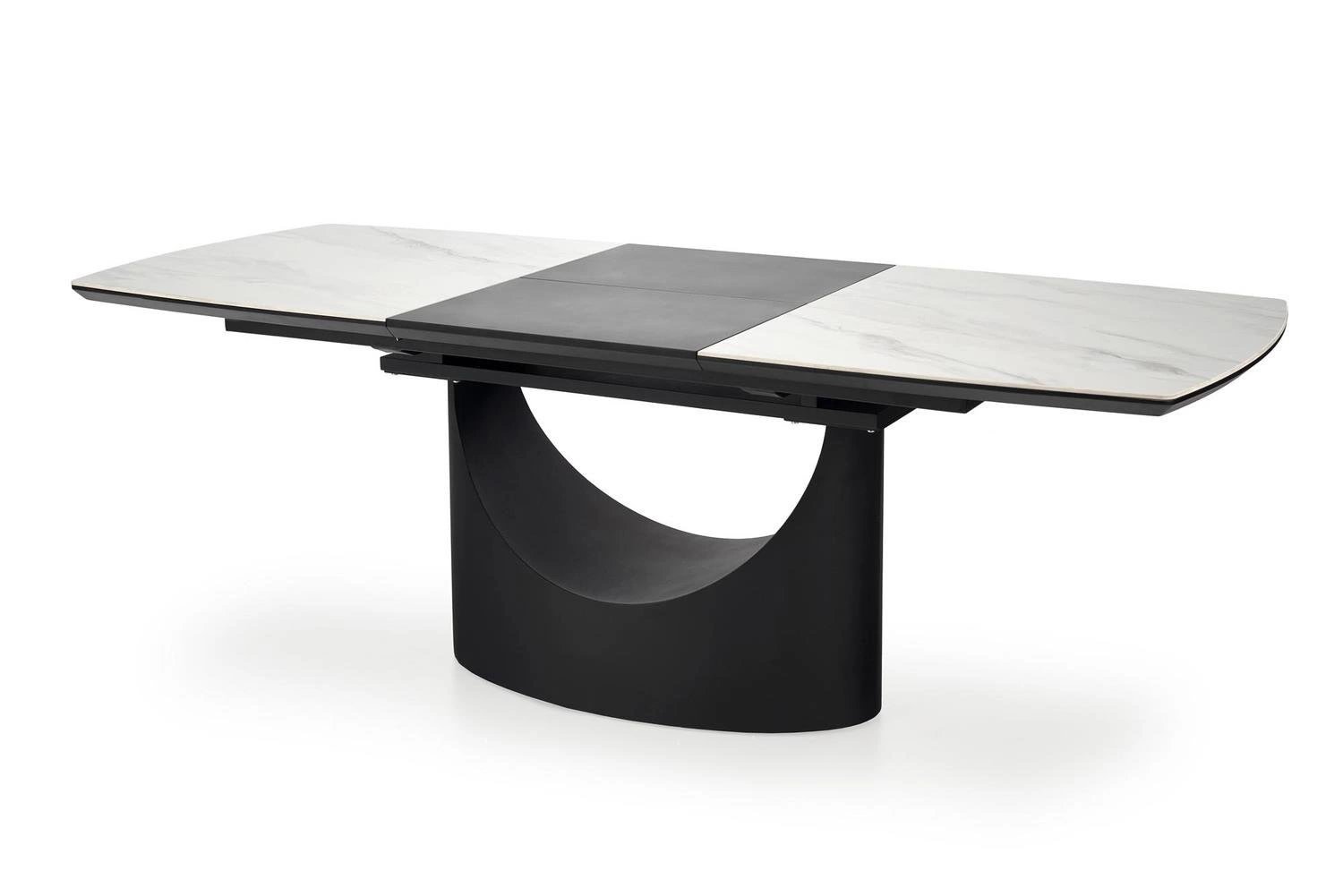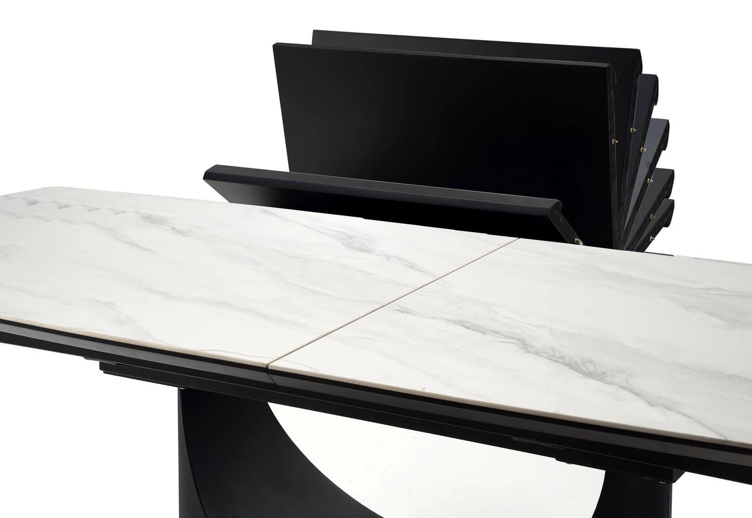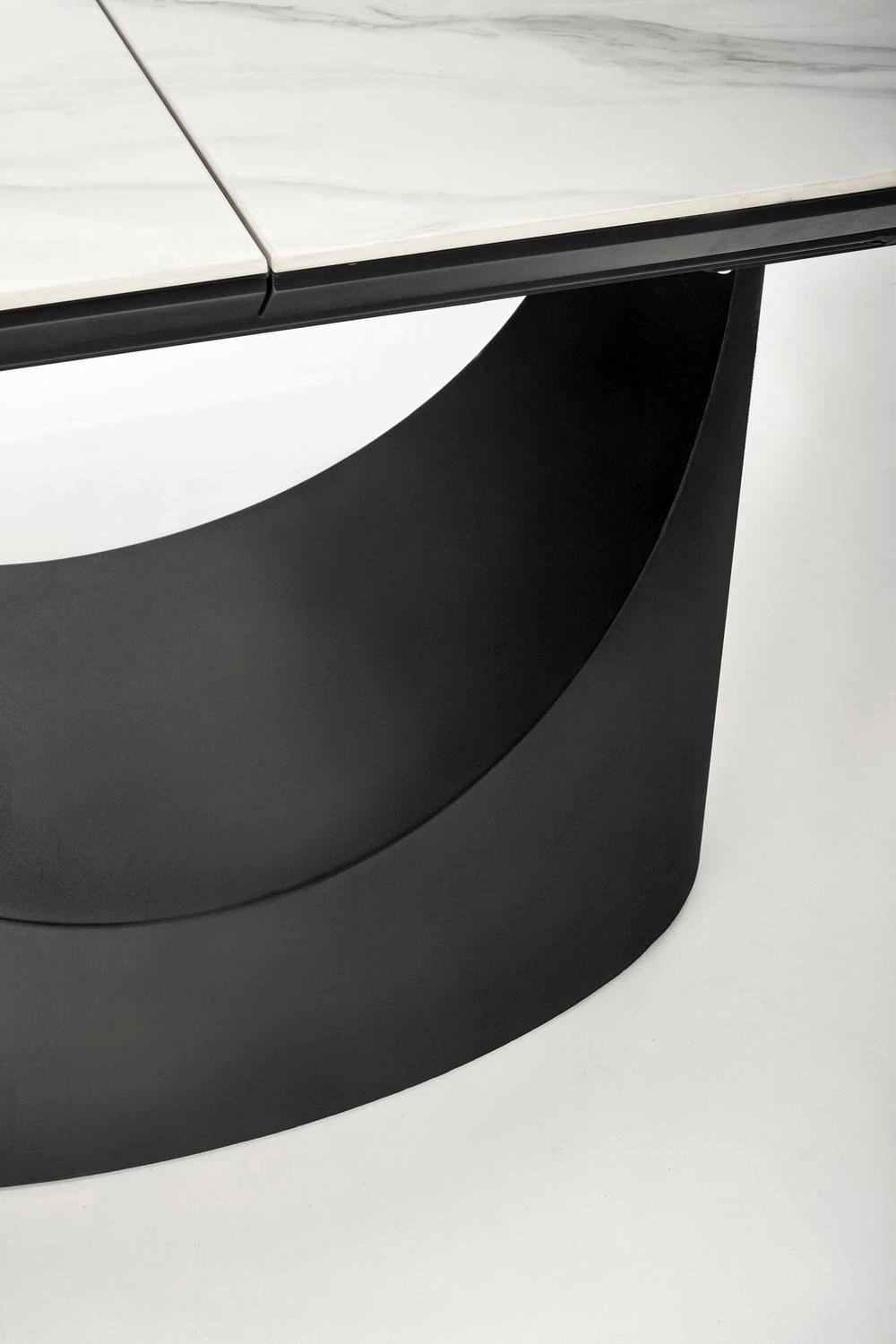 Został wykonany z wysokiej jakości materiałów, takich jak ceramika, MDF lakierowany oraz stal malowana proszkowo, co gwarantuje jego trwałość oraz odporność na uszkodzenia. Blat stołu w kolorze białego marmuru i czarnym, w połączeniu z nogą w kolorze czarnym, nadaje mu eleganckiego i nowoczesnego wyglądu.Dzięki prostokątnemu kształtowi blatu oraz jednej nodze, stół Demin zajmuje niewiele miejsca, co jest szczególnie ważne w przypadku mniejszych pomieszczeń.
