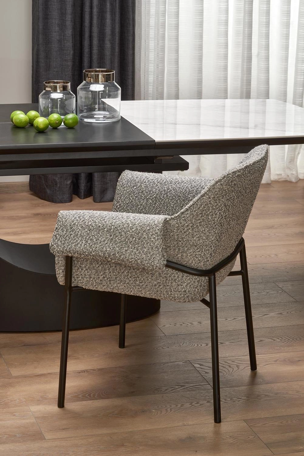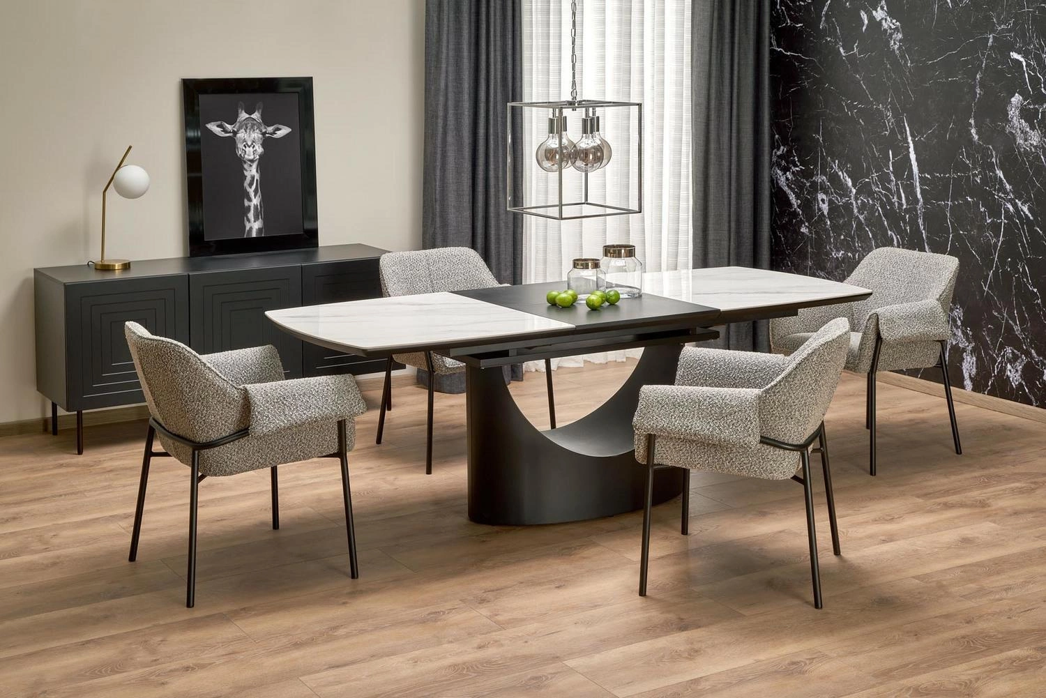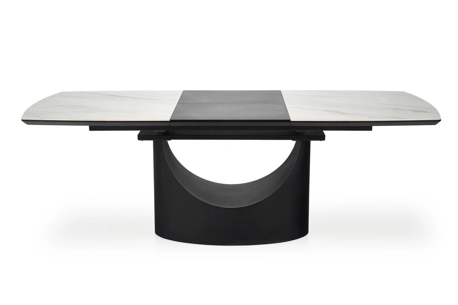 Został wykonany z wysokiej jakości materiałów, takich jak ceramika, MDF lakierowany oraz stal malowana proszkowo, co gwarantuje jego trwałość oraz odporność na uszkodzenia. Blat stołu w kolorze białego marmuru i czarnym, w połączeniu z nogą w kolorze czarnym, nadaje mu eleganckiego i nowoczesnego wyglądu.Dzięki prostokątnemu kształtowi blatu oraz jednej nodze, stół Demin zajmuje niewiele miejsca, co jest szczególnie ważne w przypadku mniejszych pomieszczeń.