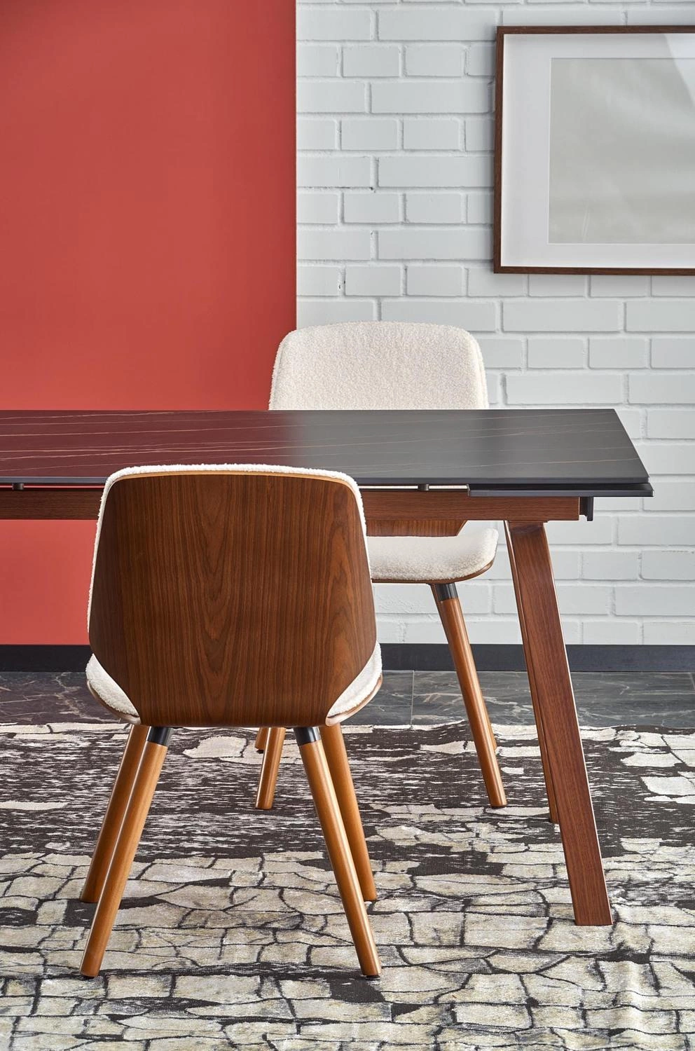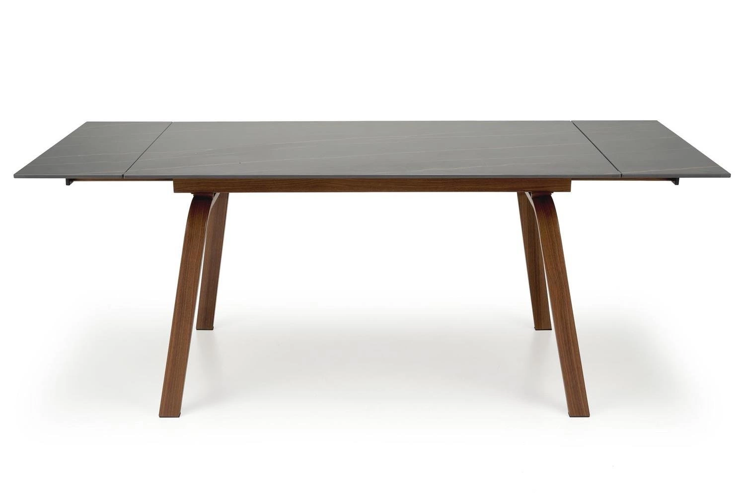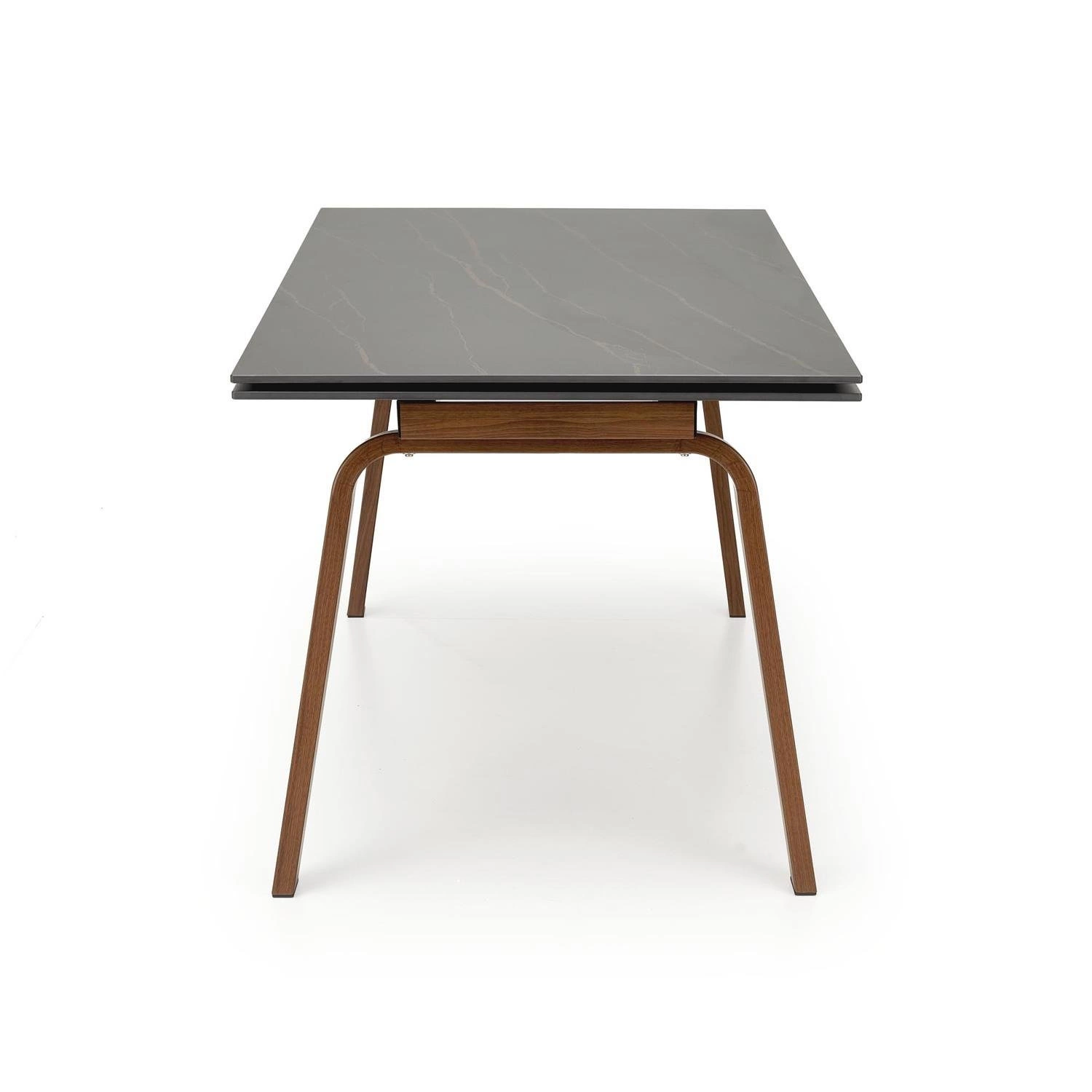 Stół został wykonany z wysokiej jakości materiałów, takich jak spiek oraz stal malowana proszkowo, co gwarantuje trwałość oraz odporność na uszkodzenia. Blat w kolorze czarnego marmuru oraz nogi w orzechowym odcieniu, tworzą niepowtarzalny design, który z pewnością zachwyci każdego miłośnika nowoczesnego stylu. Wysokość stołu wynosi 76 cm, co umożliwia wygodne siedzenie przy nim. Stelaż z metalu zapewnia stabilność oraz bezpieczeństwo użytkowania.