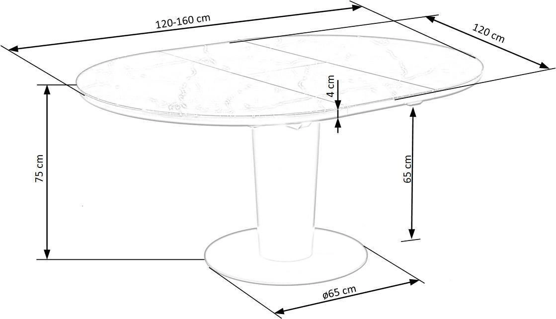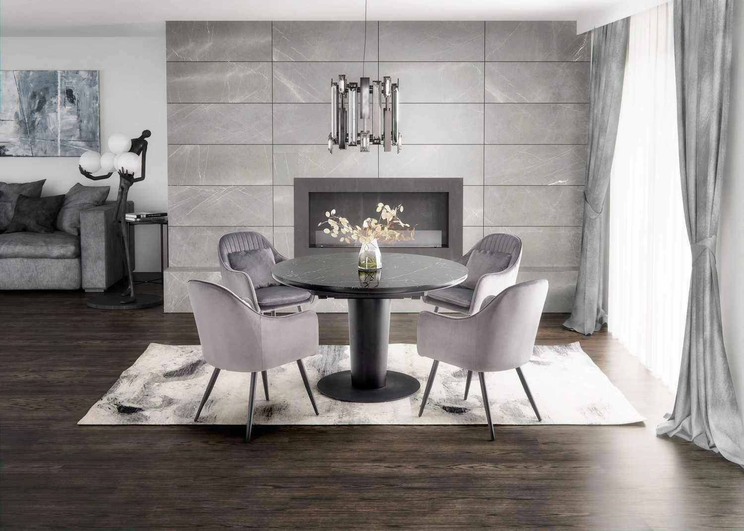 Czarny blat z marmurowym wzorem w połączeniu z czarną nogą stanowi niebanalne połączenie, które z pewnością przyciągnie uwagę Twoich gości. Wytrzymałe materiały, takie jak szkło, MDF lakierowany oraz stal malowana proszkowo, gwarantują trwałość i długotrwałe użytkowanie stołu. Solidne wykonanie oraz jedna noga sprawiają, że stół jest stabilny i niezwykle wygodny w użytkowaniu. To 8-osobowy stół, który można zmniejszyć do 5-osobowego, co sprawia, że jest idealny zarówno do większych, jak i mniejszych pomieszczeń.