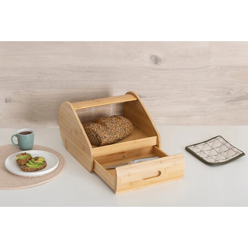 Naturalny kolor drewna bambusowego sprawia, że chlebak doskonale komponuje się z różnymi stylami wnętrz – od nowoczesnych, przez skandynawskie, aż po klasyczne aranżacje. Jego neutralna barwa oraz prosta forma sprawiają, że jest to dodatek, który nie przytłoczy pozostałych elementów wyposażenia kuchni, a jednocześnie podkreśli jej przytulny charakter. Szerokość 30,4 cm i głębokość 33 cm zapewniają odpowiednią ilość miejsca na przechowywanie pieczywa dla całej rodziny. Na co dzień możesz umieścić w nim nie tylko chleb, ale także bułki, rogale czy domowe wypieki, dbając o ich świeżość i aromat.
