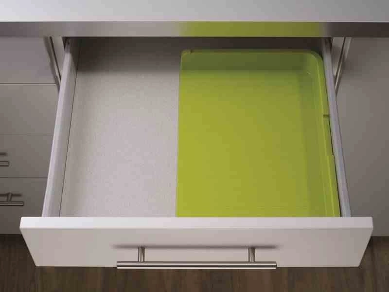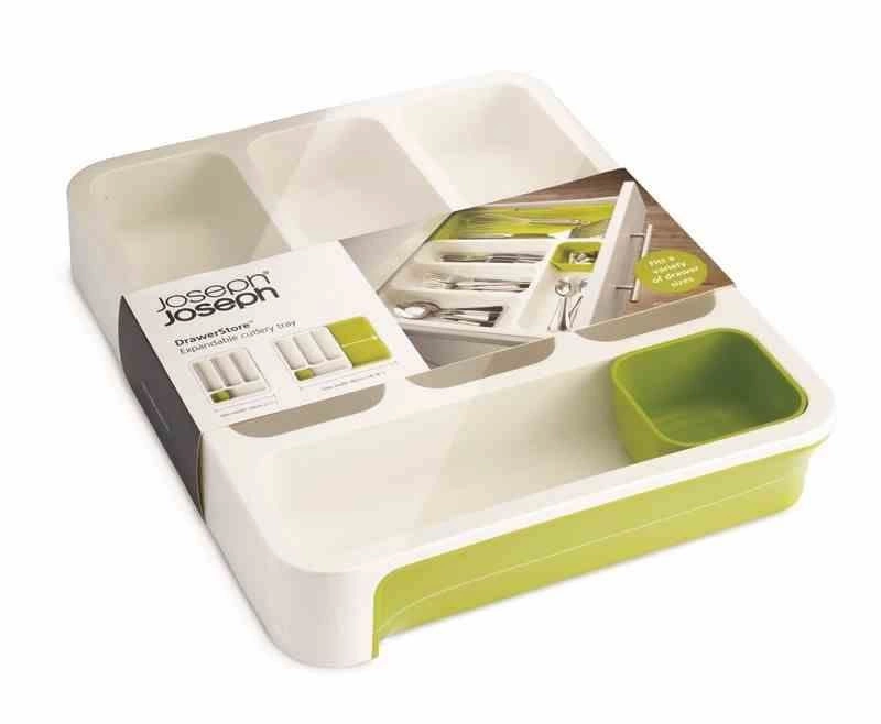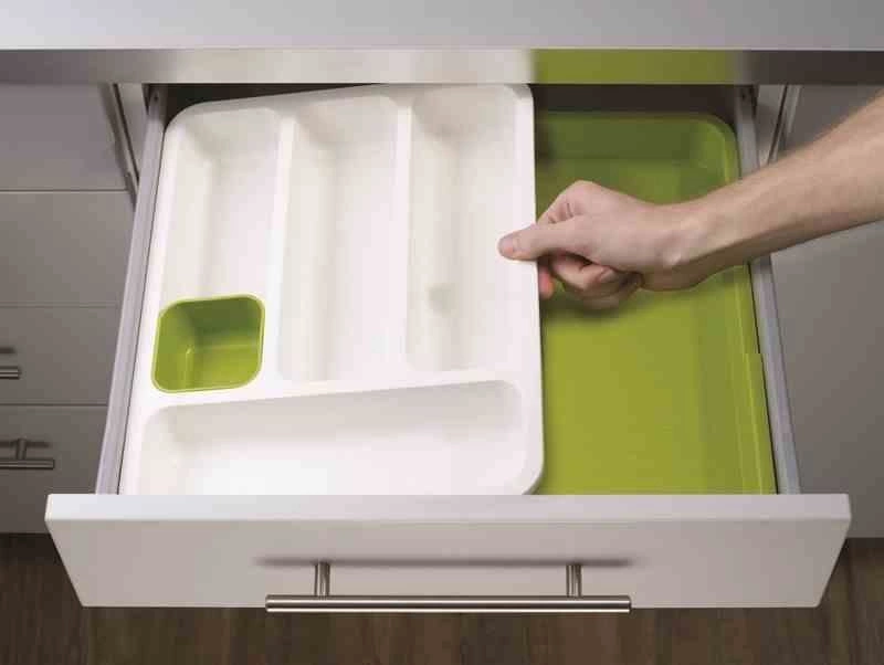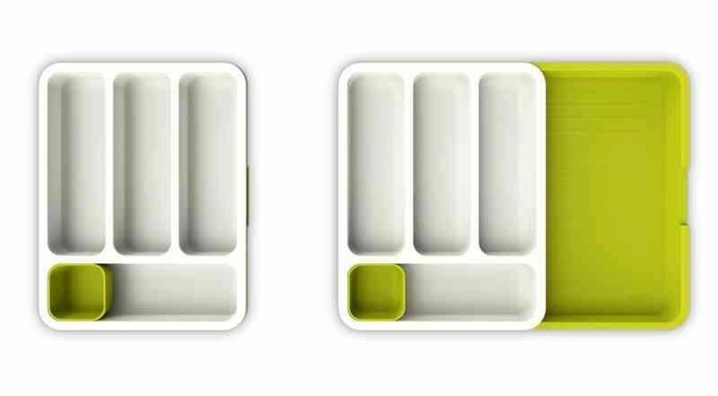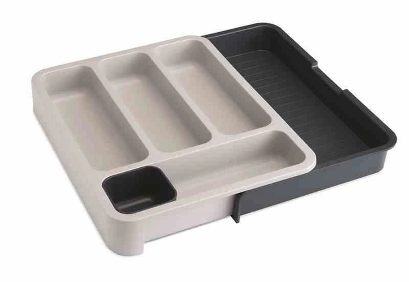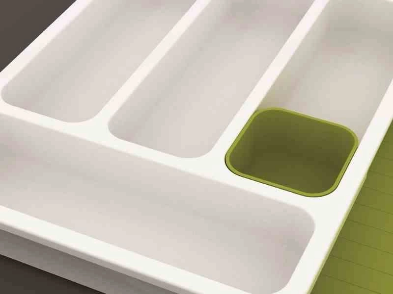 Organizer do szuflad na sztućce składa się z dwóch części, dzięki czemu pasuje do szuflad o szerokości od 28,3 do 48 cm. Po dopasowaniu odpowiedniej szerokości obie części organizatora można spiąć na stałe.