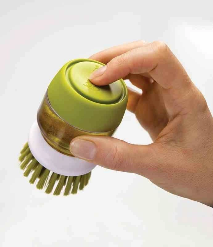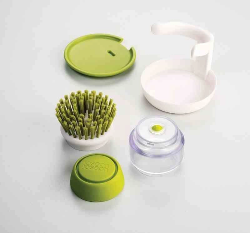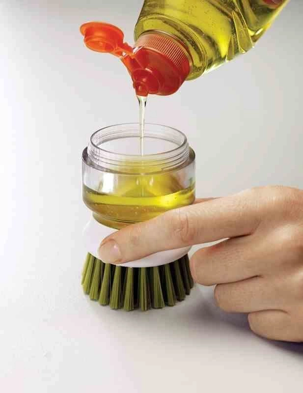 Szczotka do zmywania z pompką, szara. Innowacyjna szczotka do zmywania naczyń z podstawką. Do mycia garnków, patelni i naczyń. Składa się z pojemnika na płyn do mycia, szczotki oraz podstawki z odpływem. Wystarczy odkręcić pojemnik, nalać detergentu, zakręcić, nacisnąć górny przycisk i myć naczynia. Przezroczyste ścianki pozwalają na kontrolę ilości płynu. Przechowywanie szczotki włosiem w dół jest bardziej higieniczne – woda spływa na podstawkę, nie moczy blatów, a szczotka szybciej wysycha. Całość można zdemontować do mycia – myć ręcznie.W ofercie także zapas szczotek – artykuł nr 85039.