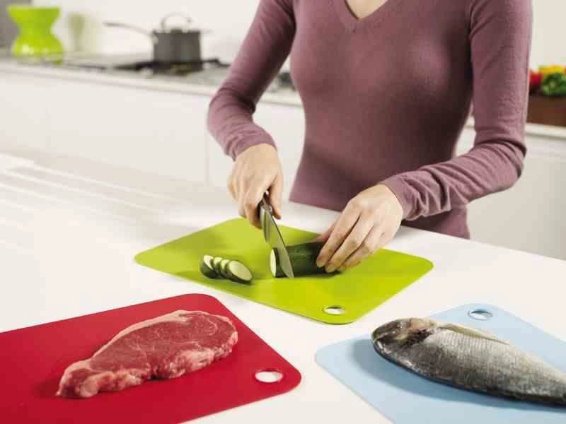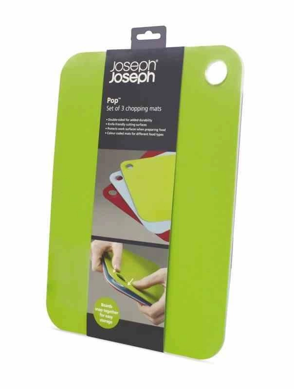 Zestaw trzech mat do krojenia Pop Zestaw trzech desek do krojenia w trzech kolorach. Zielona do krojenia warzyw, niebieska do ryb i czerwona do mięsa. Wszystkie maty można spiąć razem. Otwór pozwala na zawieszenie desek.